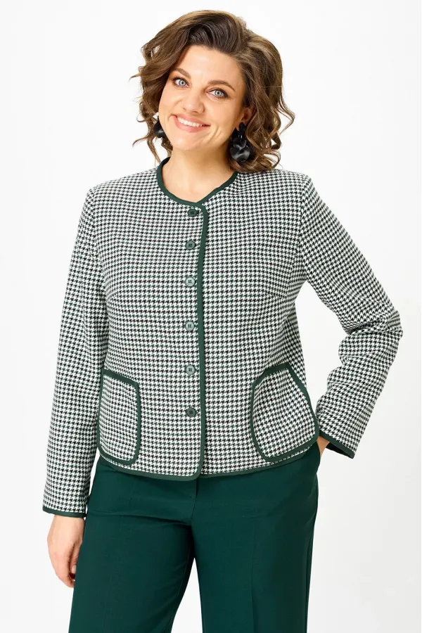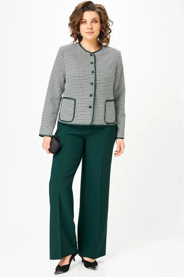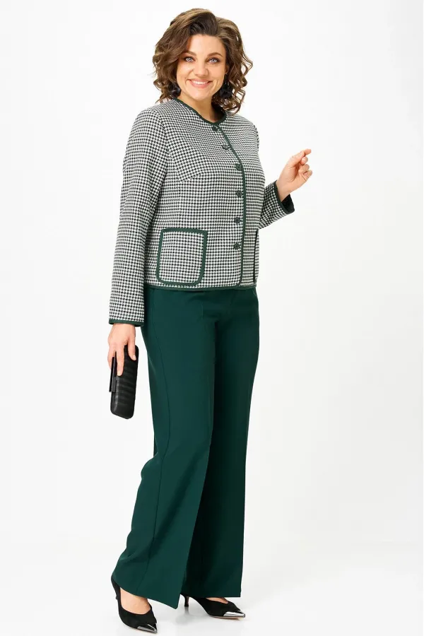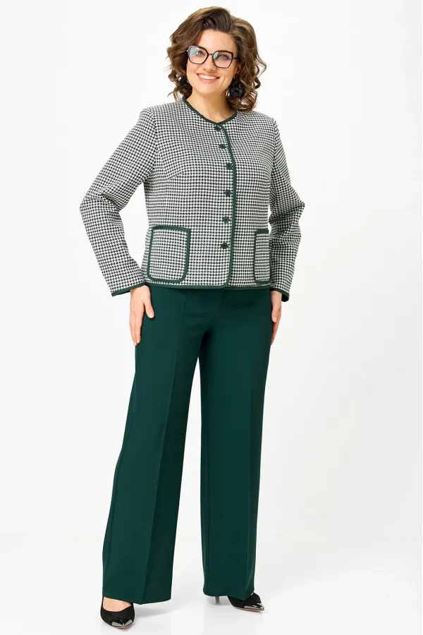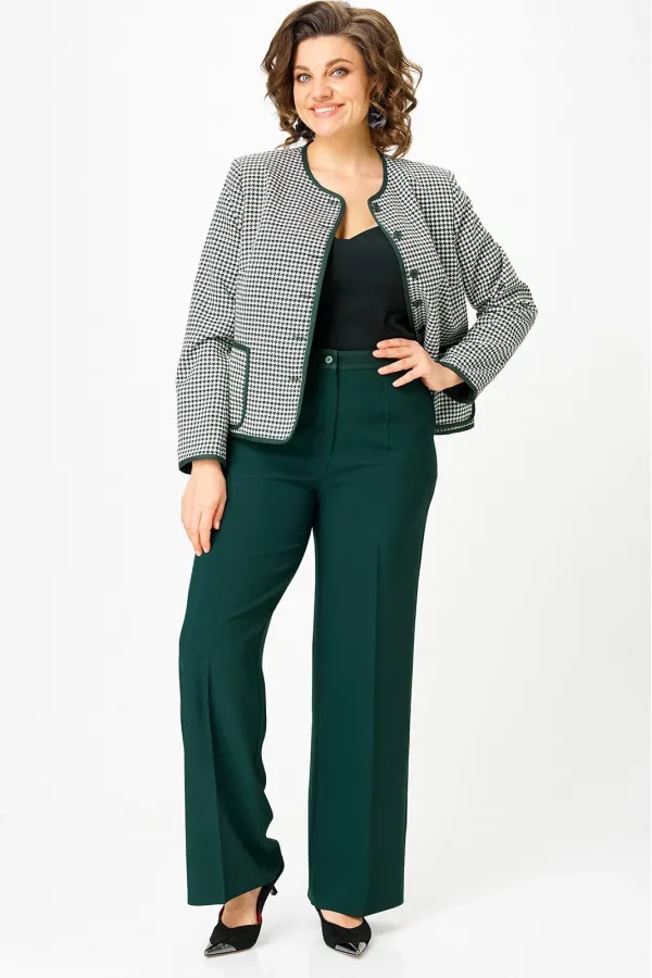 Комплект женский двухпредметный, состоящий из жакета и брюк. Жакет полуприлегающего силуэта с центральной бортовой застежкой на 6 петель-пуговиц. Перед с отрезным бочком, нагрудной вытачкой и накладными карманами фигурно... Читать далее...