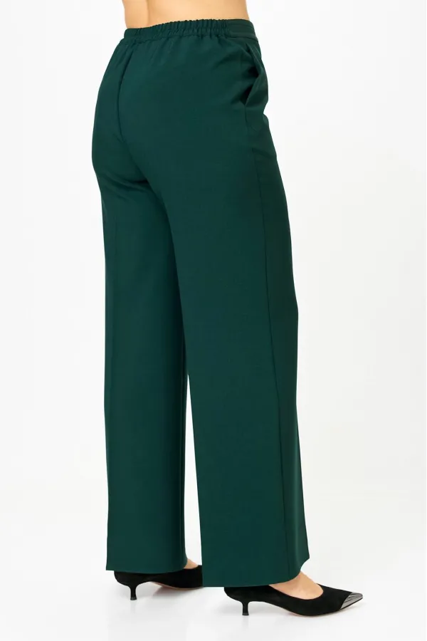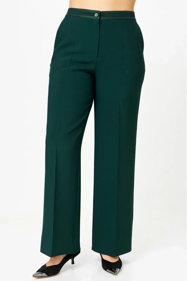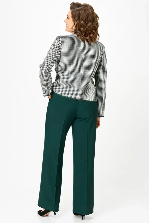 Комплект женский двухпредметный, состоящий из жакета и брюк. Жакет полуприлегающего силуэта с центральной бортовой застежкой на 6 петель-пуговиц. Перед с отрезным бочком, нагрудной вытачкой и накладными карманами фигурной формы. Горловина ии крой борта имеют закругленную форму. Края горловины, борта, низа изделия и рукавов, а также карманы окантованы контрастной киперной тесьмой. Спинка со средним швом. Рукав втачной двухшовный, длинный. Брюки классического кроя, расширенные от бедра, с заутюженными кантами и с притачным поясом сзади на резинке. По краям пояса передних половинок брюк настрочена узкая киперная тесьма. Застежка на тесьму-молнию в передних половинках и петлю-пуговицу по поясу.