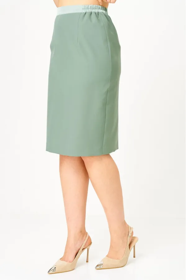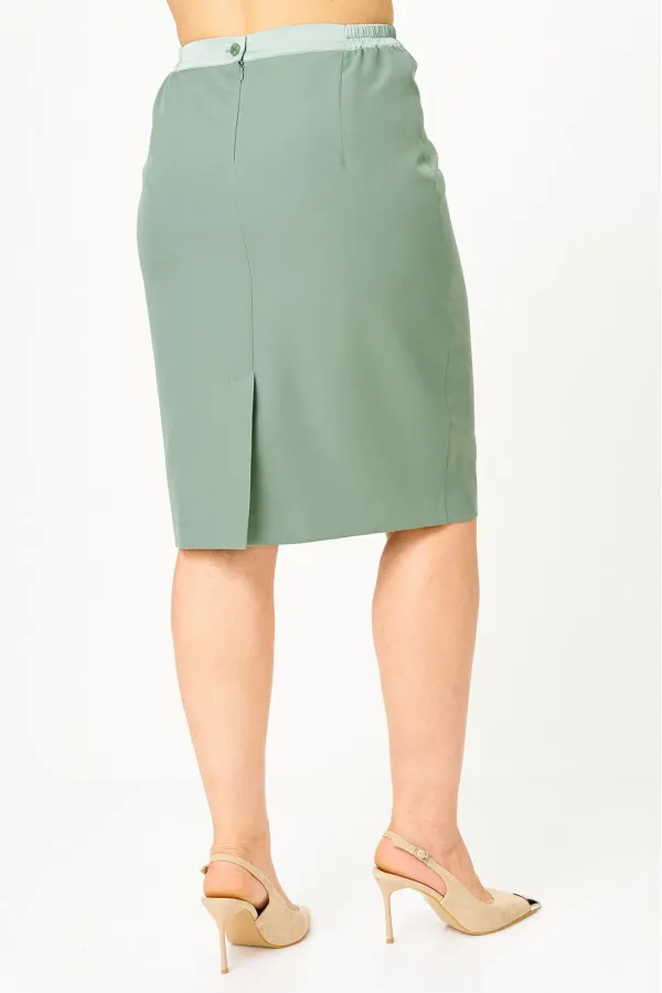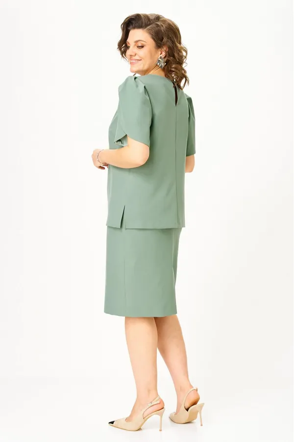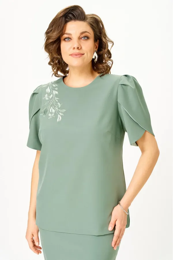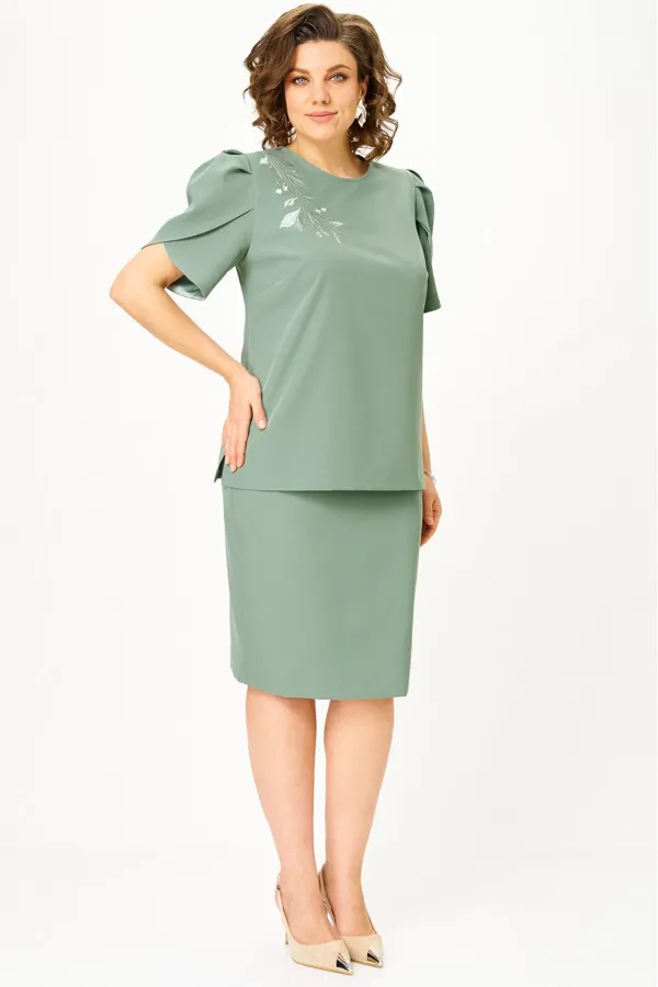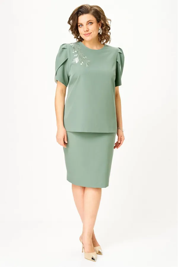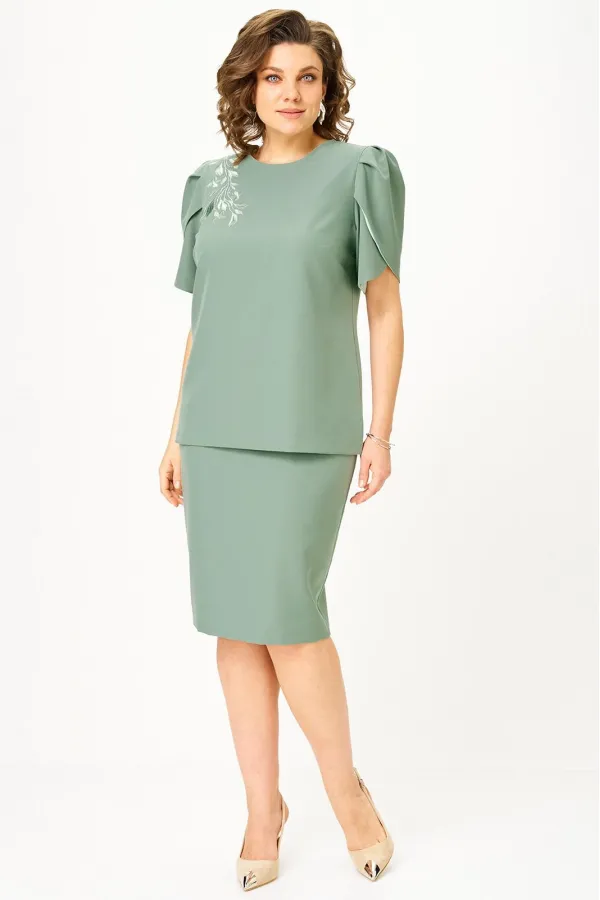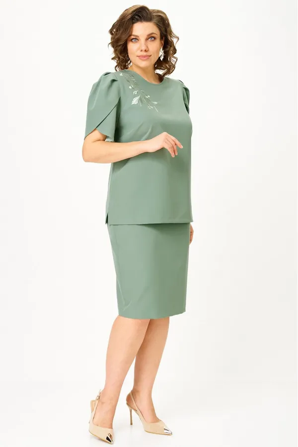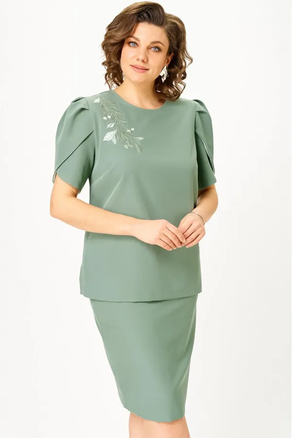 Костюм женский двухпредметный, состоящий из блузы и юбки. Блуза прямого силуэта, декорированная вышивкой, с нагрудными вытачками, выходящими из боковых швов, и с разрезами. Спинка со средним швом, в котором обработан разрез с навесной петлей и пуговицей. Горловина овальной формы. Рукава короткие фантазийной формы на запах со складками по окату. Рукав двойной, обтачен атласной тканью. Юбка-карандаш длиной до линии колена, с притачным поясом из атласа, на резинке между талиевыми вытачками. Заднее полотнище со средним швом, заканчивающимся шлицей. Застежка на одну петлю-пуговицу по поясу и тесьму-молнию в среднем шве.