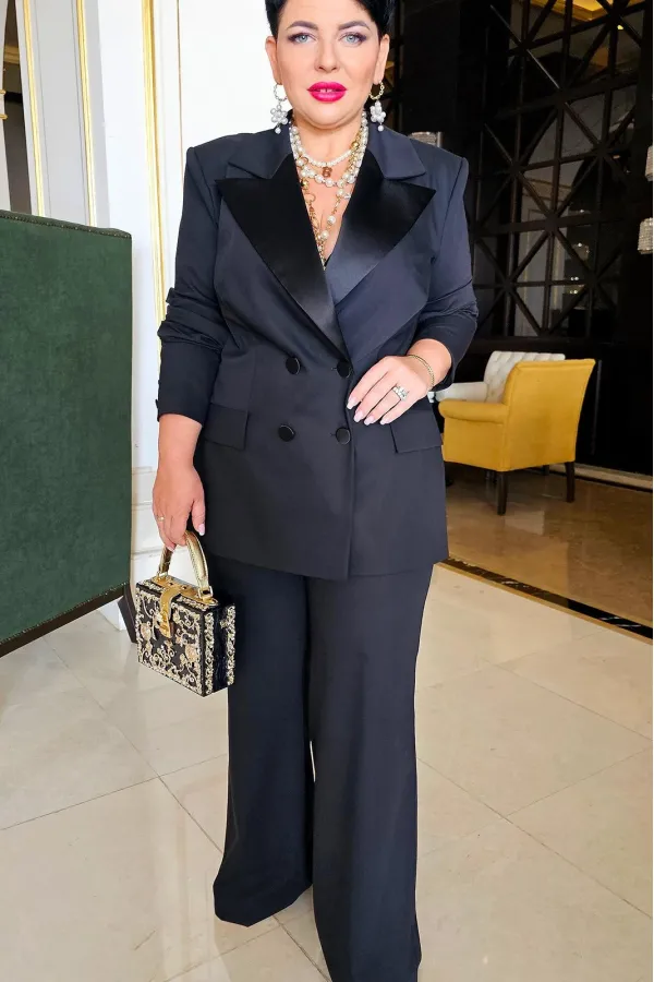 Стильный костюм с брюками – клёш создан в духе последних тенденций модной индустрии! В нем Вы будете чувствовать себя комфортно и неотразимо. Жакет «oversize» прекрасно скрывает недостатки фигуры, а брюки визуально удлиняют ноги. Костюм отлично подойдёт для торжественных мероприятий. Жакет прямого силуэта, удлинённый, с двубортной застежкой на петли и пуговицы, воротник отложной с широкими лацканами пиджачного типа из отделочной ткани. По переду жакета талиевые вытачки и отделочные клапана. Спинка с плечевыми вытачками, средним швом, заканчивающимся отлетной шлицей. Рукав втачной, двухшовный с отделкой в виде пуговиц по низу рукава. Жакет на подкладке. Брюки удлинённые, клёш от колена. Застежка на тесьму молнию в гульфике и пуговицу по центру переда. Пояс притачной с эластичной тесьмой в задней части брюк, которая обеспечивает максимально комфортную посадку на любой тип фигуры. Длина жакета вдоль середины спинки от шва втачивания воротника 71,5 см (р.50-54), 73 см (р.56-60). Длина рукава 61 см. Длина брюк по боковому шву 108 см.
