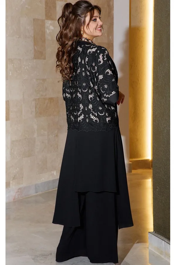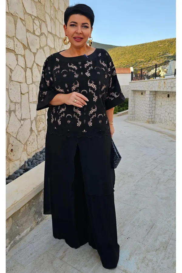Роскошный женский комплект, состоящий из кружевной блузки и широких многослойных брюк, выглядит очень нарядно и подойдет для любого особого случая!