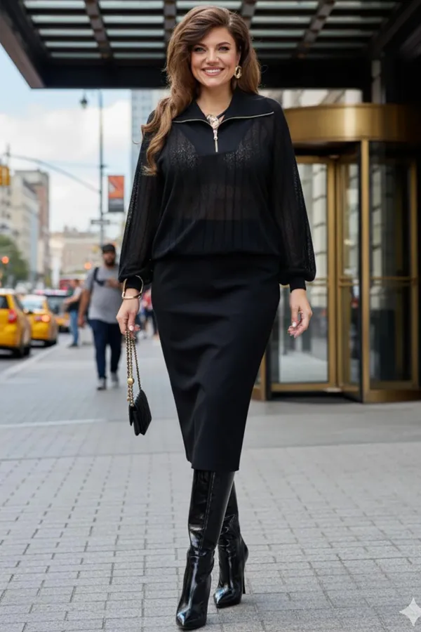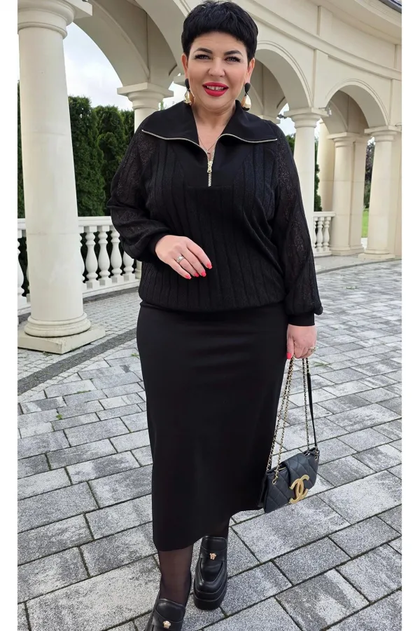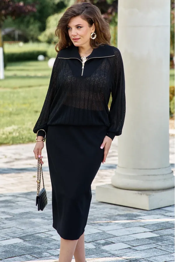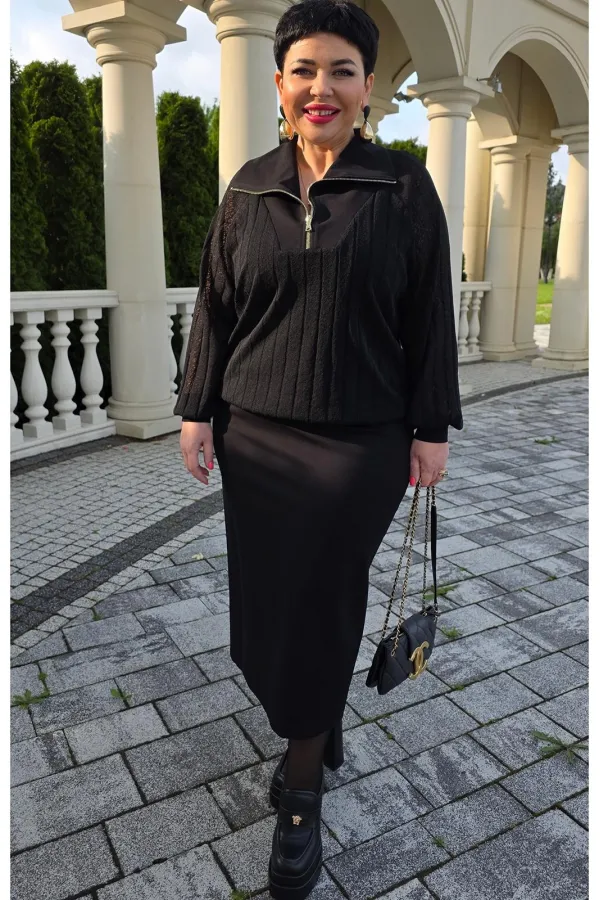 Комплект женский, состоящий из джемпера и юбки. Джемпер черного цвета, из полупрозрачного материала, его фактура — эффект гофре — это складки, они играют со светом, то поглощая его, то отпуская, создавая живое, дышащее п... Читать далее...