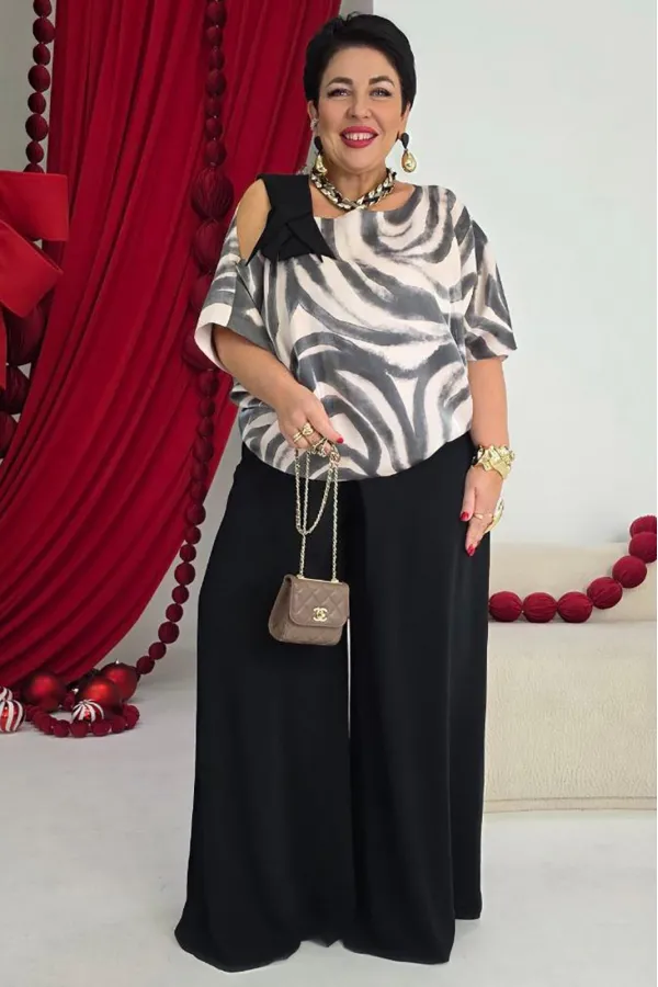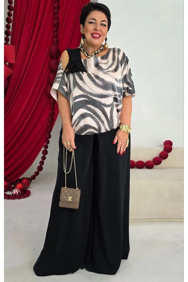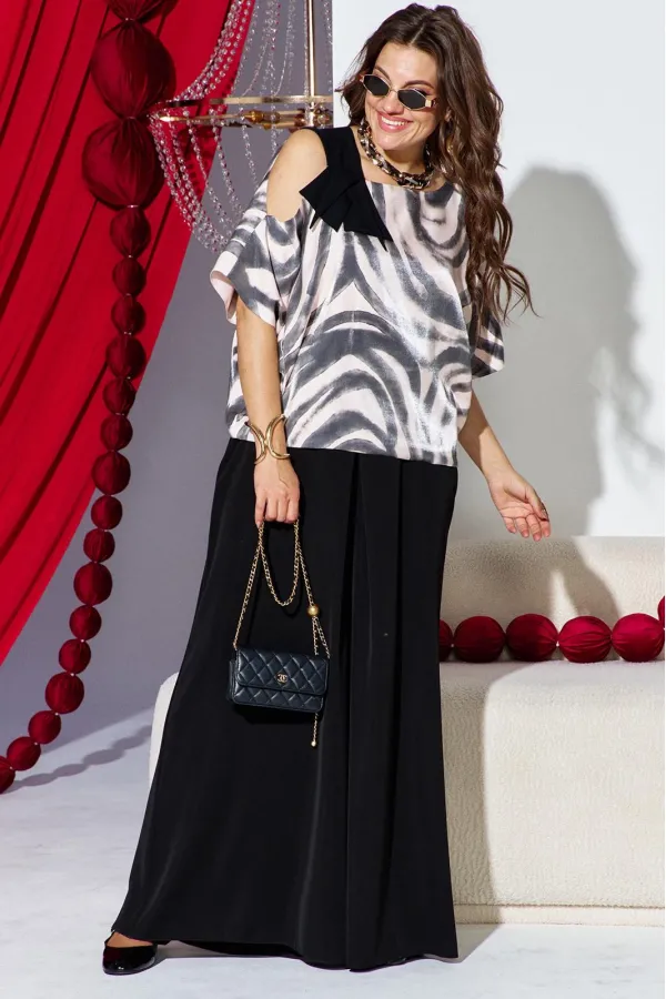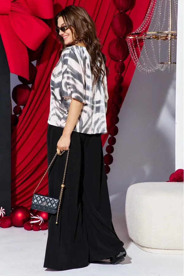 Это стильный и современный ансамбль, который состоит из блузы и брюк. Изысканный женский комплект идеален для торжественных мероприятий, он станет жемчужиной вашего гардероба. Брючный комплект можно дополнить минималистичными украшениями, которые подчеркнут утончённость, завершая этот элегантный, но уверенный образ. Блуза свободного силуэта с асимметричной формой горловины: одно плечо открыто, расположен декоративный элемент чёрного цвета из отделочной ткани. Рукав цельнокроеный. Спинка без особенностей. Блуза на подкладке. Брюки свободного кроя выполнены из плотной, матовой ткани чёрного цвета. Их широкий фасон и высокая посадка на талии создают элегантный и удлинённый силуэт, а также контрастируют с лёгким и воздушным верхом. Пояс в брюках притачной со вставкой эластичной тесьмы-резинки в бочках. По переду брюк от пояса застрачивается складка. В среднем шве брюк застёжка на потайную тесьму молнию и пуговицу в поясе. Длина блузы 56,5 см (р 52-56), 57,5 см (р 58-62), длина рукава 36,5 см (р 52-56), 37,5 см (р 58-62). Длина брюк 108 см.