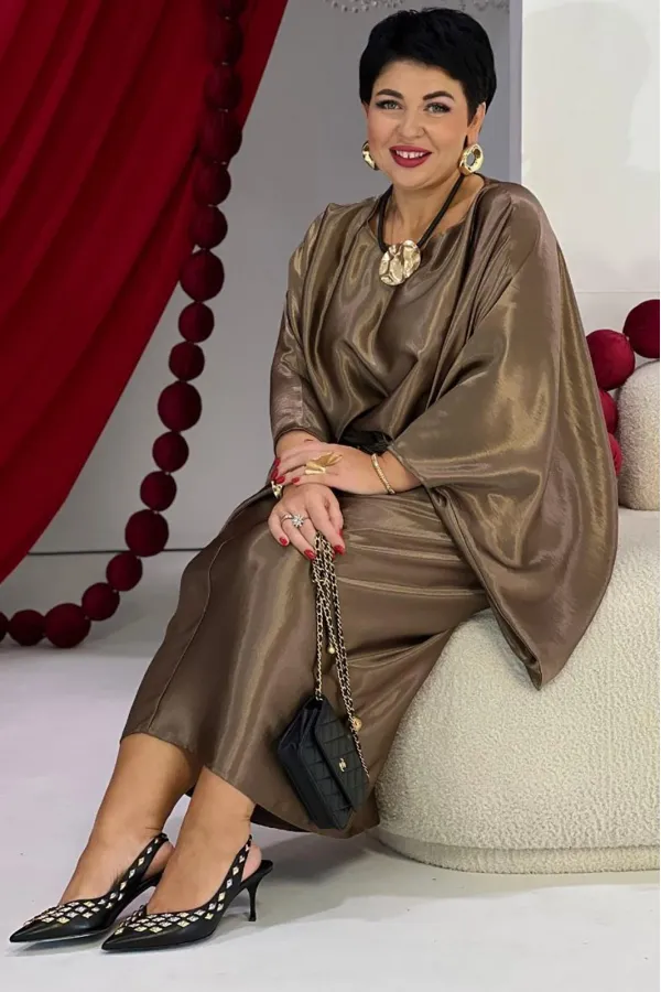 Общий образ — союз современных линий и благородного сияния. Контраст между строгой геометрией прямоугольной блузы и плавной свободой рукавов, и между богатым блеском ткани создаёт костюм, который подходит для торжественных мероприятий и вечерних встреч, сохраняя при этом эффект лёгкой воздушности и неповторимой эстетики. Это наряд, в котором каждый штрих продуман до мельчайших деталей, чтобы подчеркивать женственность и уверенность в любом световом окружении. Грациозный костюм встречает восходящую элегантность — блуза прямоугольного силуэта с рукавом кимоно и юбка миди, завязывающаяся впереди узлом, выполнены в стильном перламутрово-золотом оттенке. Блуза держится по линии плеча строго и уверенно, но её рукав-кимоно добавляет свободную плавность движению и нежную асимметрию. Головина по форме «лодочка», линия плеча спущенная. Фасон прямоугольной блузы подчеркивает минимализм, который обретает характер за счёт текстуры и сияния. Рукав-кимоно свободен в движении, но его концы и края тщательно обработаны, образуя спокойную, но выразительную линию по всей длине руки. Юбка миди завершает композицию: она облегает талию и плавно расходится к низу, не теряя движения. Завязка спереди образует аккуратный узел, который служит ярким акцентом и одновременно функциональной деталью, позволяющей регулировать посадку. Лаконичная посадка сочетается с мягким мерцанием ткани — переливы золотого и перламутра, будто собрались в узоре мелких светлячков, танцующих на поверхности материала. В оригинальности образу помогает отсутствие лишних деталей — всё в этом костюме рождает ощущение продуманной сдержанности. Длина по спинке блузы 54,5 см (р 50-54), 56,5 см (р 56-60). Длина рукава 54 см (р 50-54), 55 см (р 56-60). Длина юбки 98 см.