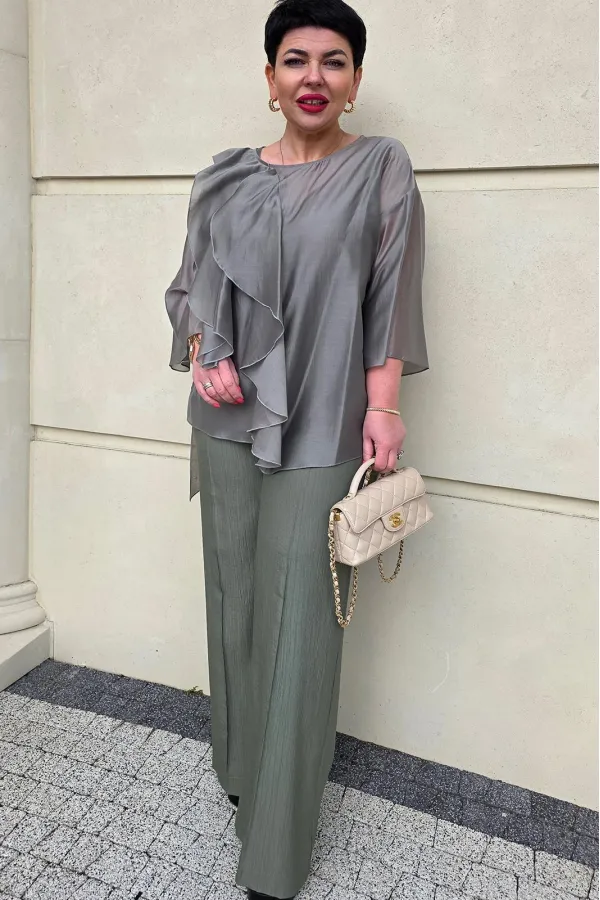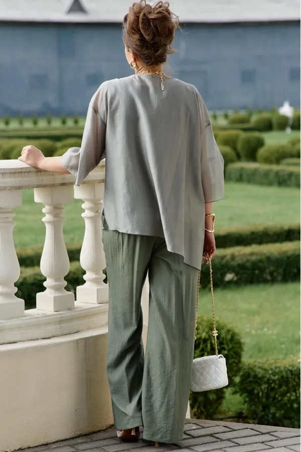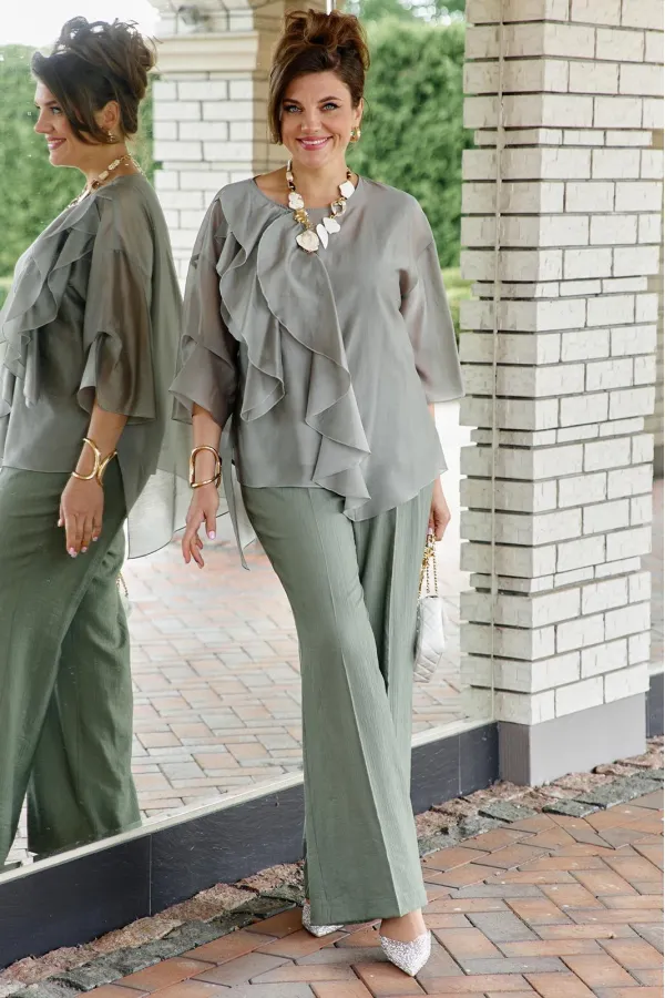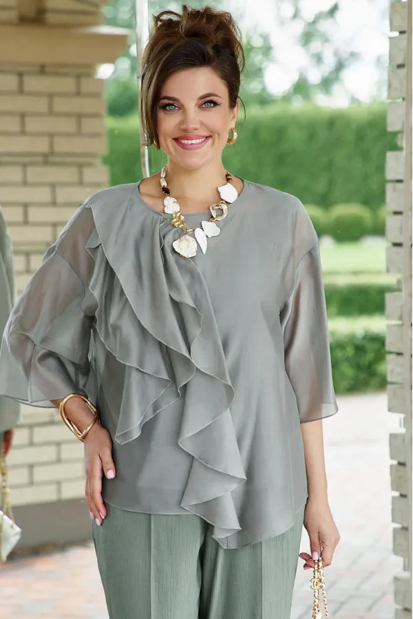 Комплект женский, трёх-предметный, состоящий из верхней блузы, нижней блузы и брюк. Вуалирующая прозрачность блузы, скрывает несовершенства фигуры, и создает идеальный силуэт, а брюки из ткани с «жатой» фактурой стройнят и вытягивают силуэт. Верхняя блуза свободного силуэта с округлой формой горловины. Линия плеча спущенная. Рукав втачной, длинной ¾ с декоративным защипом. Спинка без особенностей. Низ в блузе ассиметричный с разрезами в боковых швах. Главным акцентом блузы являются отделочные вставки в подрезе в виде рюш.