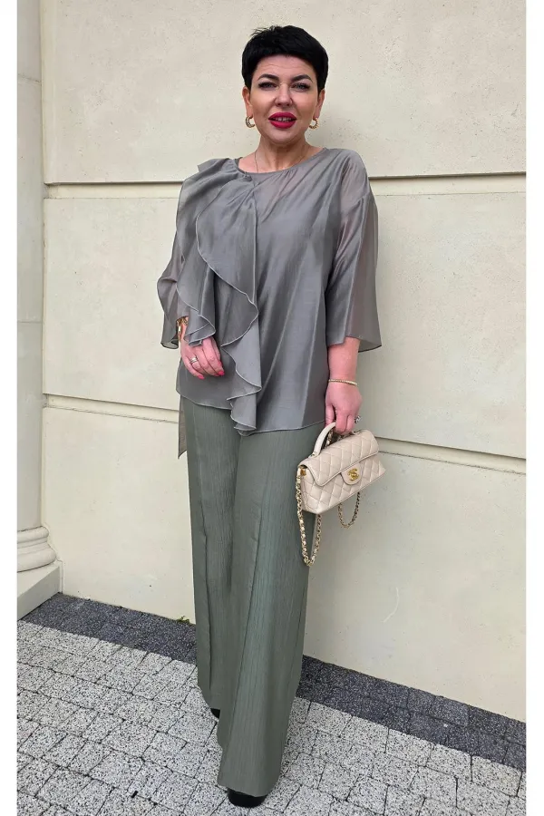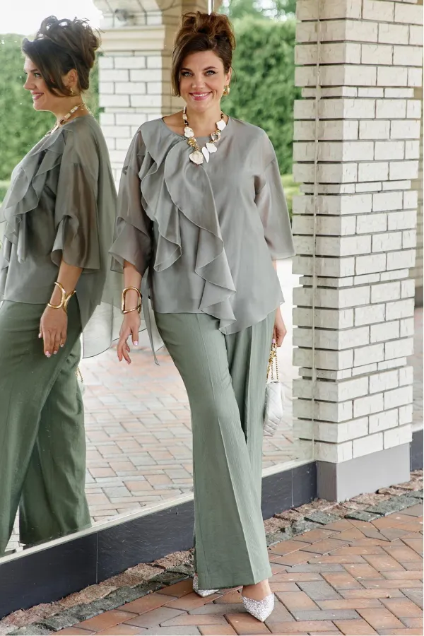 Комплект женский, состоящий из верхней блузы, нижней блузы и брюк. Вуалирующая прозрачность блузы, скрывает несовершенства фигуры, и создает идеальный силуэт, а брюки из ткани с «жатой» фактурой стройнят и вытягивают сил... Читать далее...