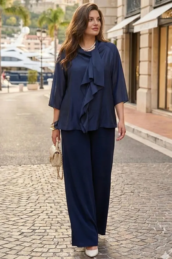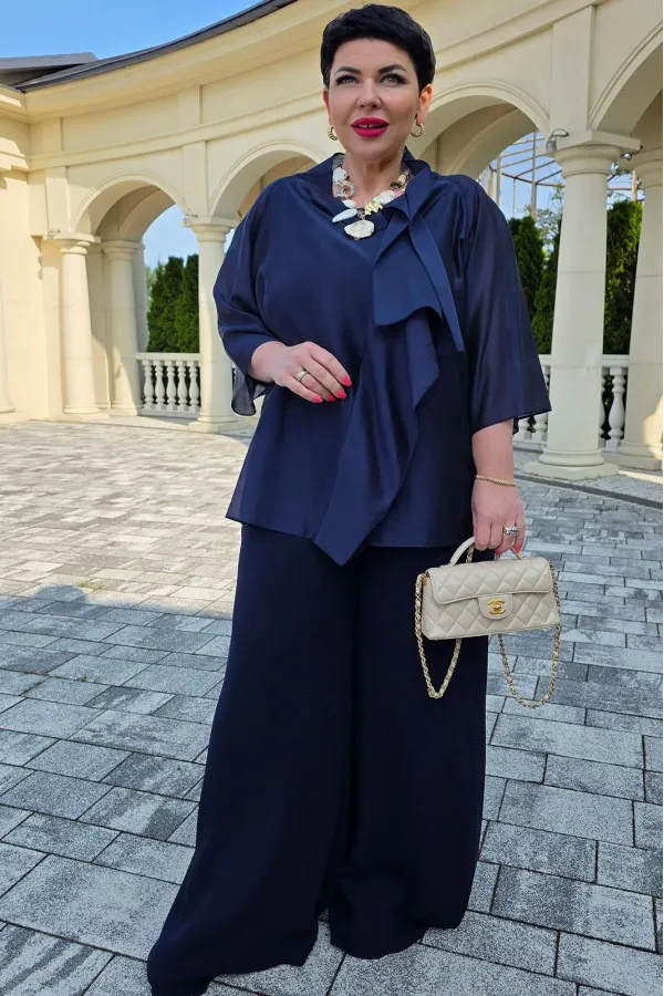Элегантный брючный костюм, выполненный в мерцающем оттенке, который идеально подходит для создания утонченных образов. Комплект состоит из свободной блузы широких брюк палаццо, обеспечивая непревзойденный комфорт и легкость движений. Блуза привлекает внимание своим асимметричным дизайном с драпировками и широким, ниспадающим воротником, который придает образу динамичность и изысканность. Блуза свободного силуэта, с двойными деталями переда и спинки. Головина округлой формы. Рукав в блузе реглан, длиной ¾, что добавляет силуэту легкости и воздушности. В боковых швах блузы разрезы. Брюки с высокой посадкой и струящимся кроем визуально удлиняют ноги, создавая безупречный и гармоничный ансамбль. Этот костюм идеально подходит как для торжественных мероприятий, так и для деловых встреч, подчеркивая ваш безупречный вкус и чувство стиля. Длина блузы по спинке 68 см. Длина рукава блузы 48 см (р 50-54), 49 см (р 56-60). Длина брюк по боковому шву 108см (р 50-56), 108,5 см (р 58-60).