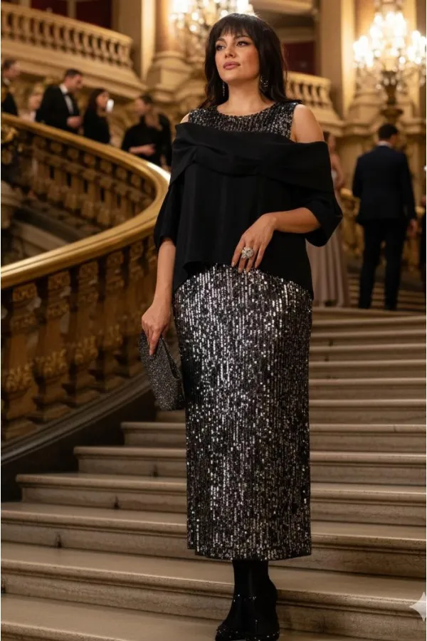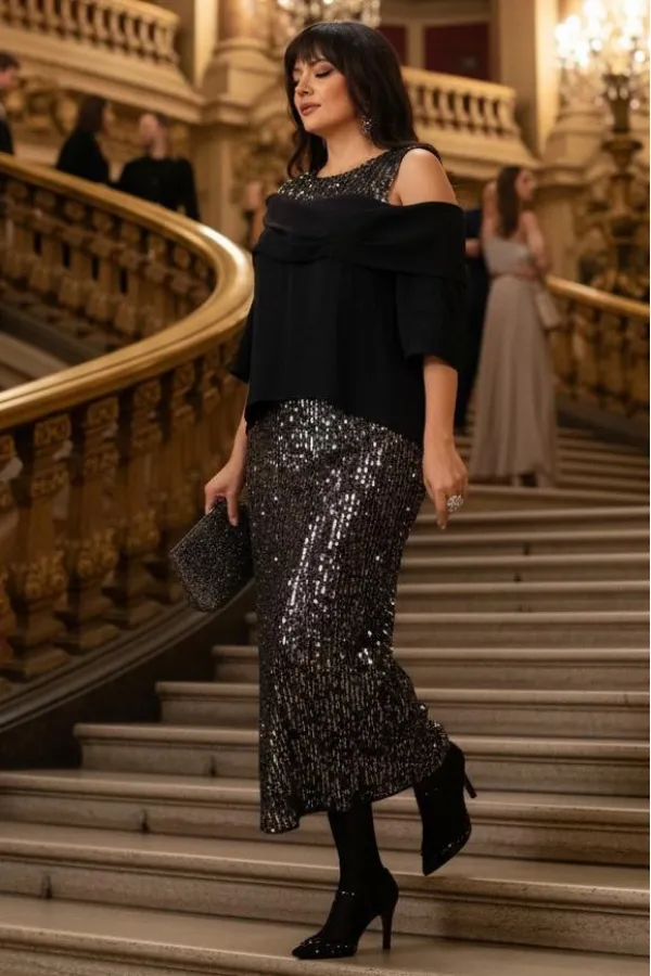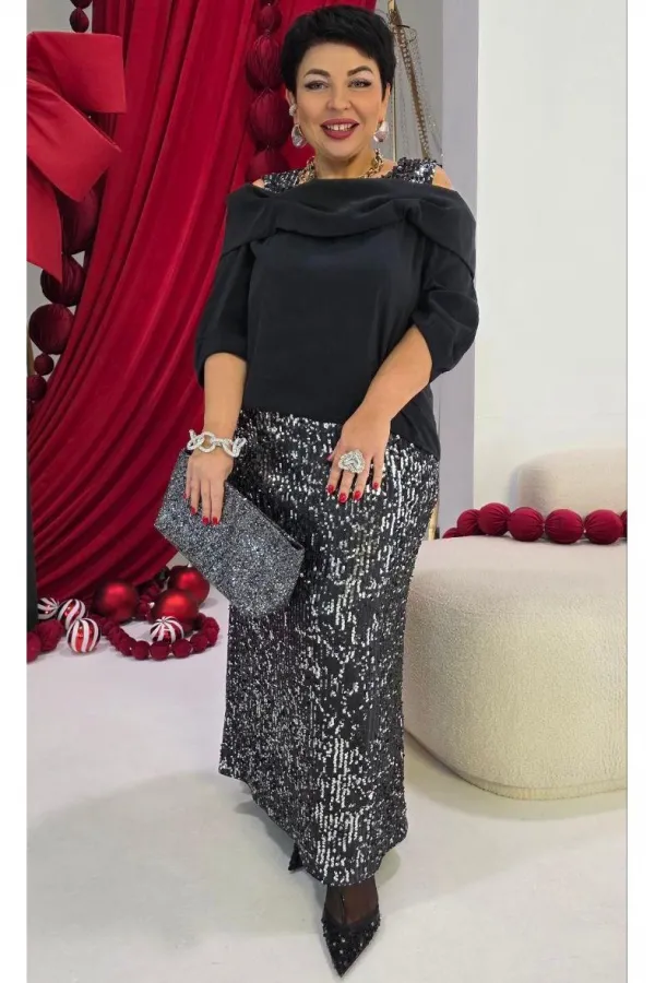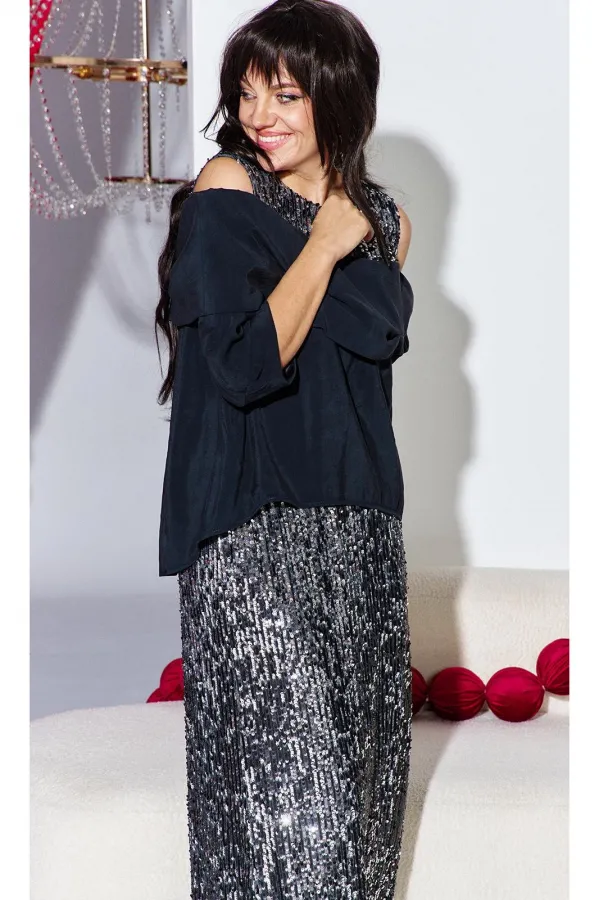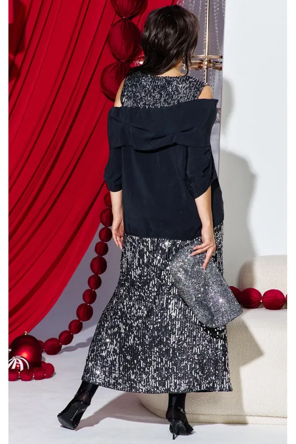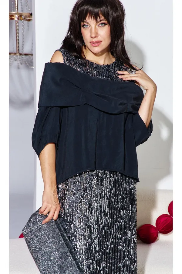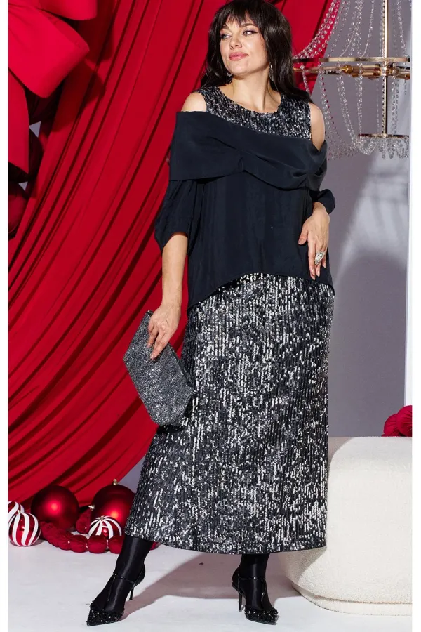 Этот юбочный комплект — для женщины, которая не боится владеть вниманием. Если Вы ищете идеальное сочетание стиля и комфорта, вот идеальный выбор. Комплект женский, состоящий из блузона и юбки. Блузон — это настоящая скульптурная форма. Он начинается с откровенной игры линий: мягко ниспадая с плеч, он обнажает изящные ключицы и линию декольте. Блузон свободной формы с ассиметричным вырезом декольте, отложным воротником с декоративными защипами. По переду и спинке блузона отрезная кокетка из отделочной ткани — пайетки. Низ в платье ассиметричный, боковой шов в блузоне переходит на перёд. Рукав втачной, фигурной формы с декоративным подрезом, длиной ¾. Юбка длины « миди», прямого силуэта немного расширяется к низу. Пояс в юбке цельнокроеный с эластичной тесьмой-резинкой. Длина миди придаёт образу неустаревающую классику и грацию. Плотное полотно, сплошь усыпанное мелкими пайетками графитового и серебристого оттенков, не просто отражает свет, а мягко излучает собственное, приглушённое свечение. Юбка на подкладке. Длина блузы по спинке 71 см (р 48-52), 73 см (р 54-58). Длина рукава левого/правого 27/39 см. Длина юбки 96 см.