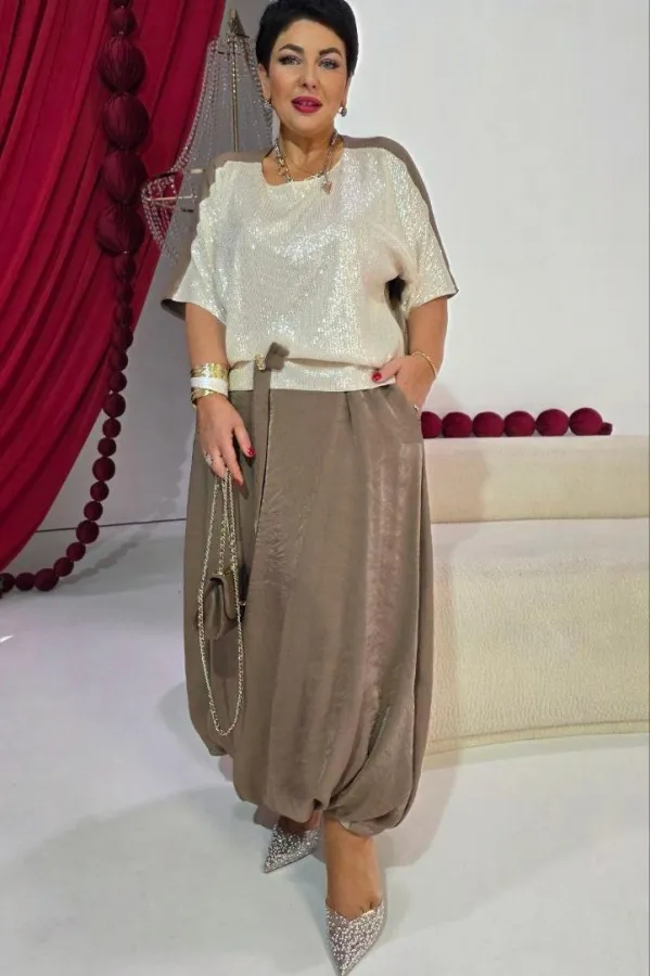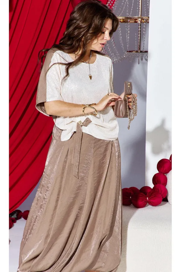 Комплект женский юбочный, двух-предметный, состоящий из блузы и юбки-балон. Комплект держится в гармонии за счёт контраста фактур: гладкая блуза с акцентной вставкой из отделочной ткани- светлой пайетки по переду и факту... Читать далее...