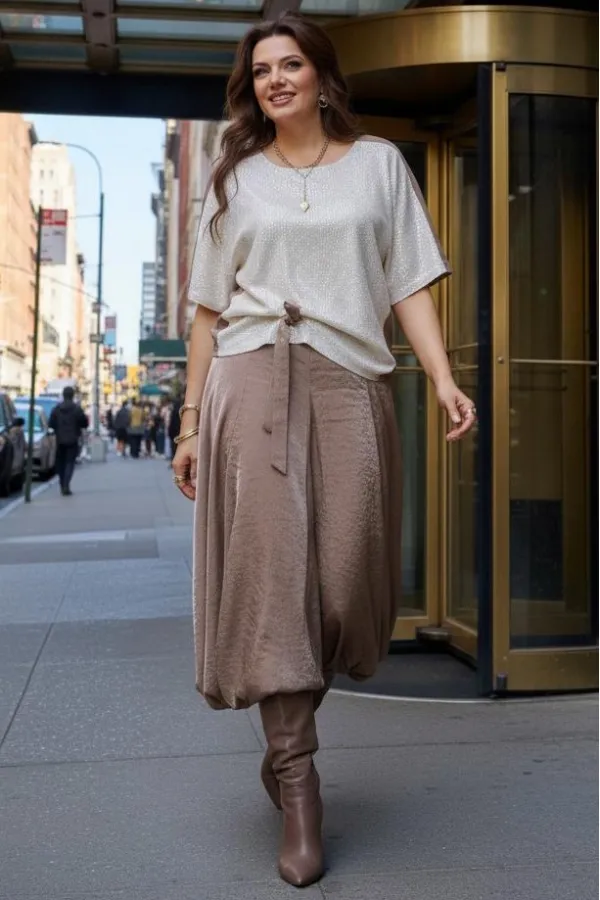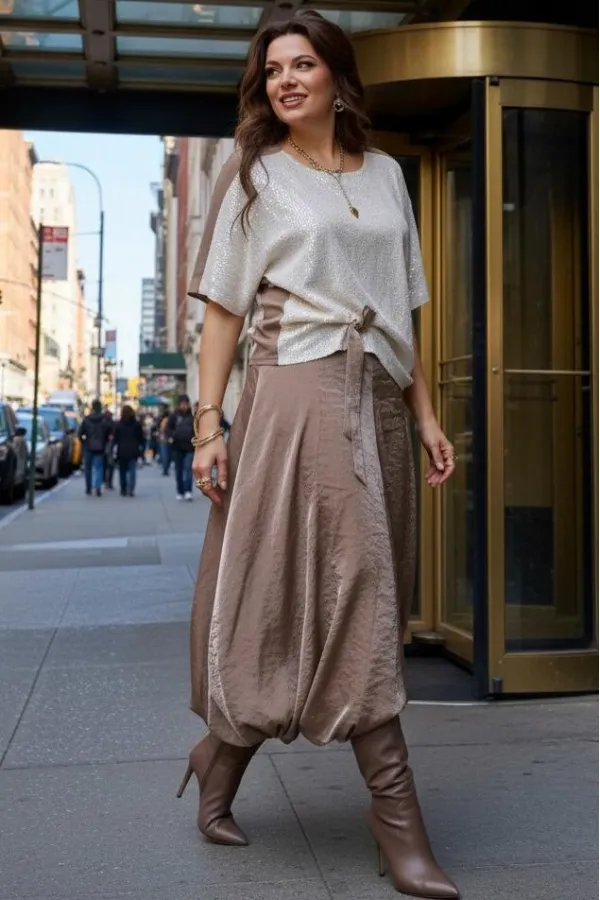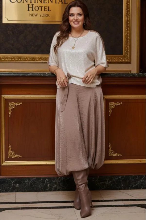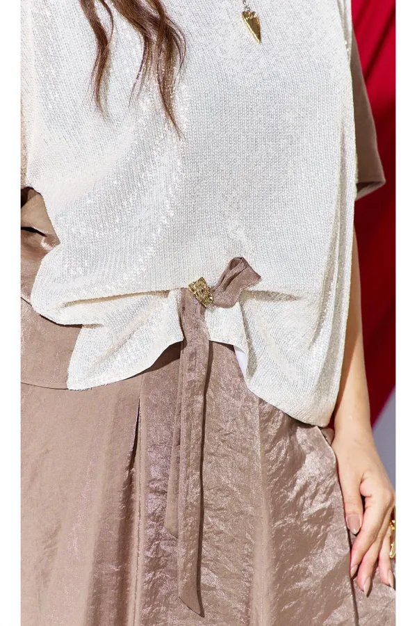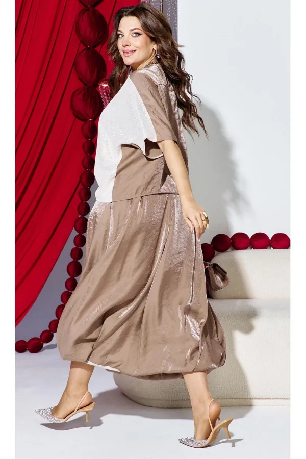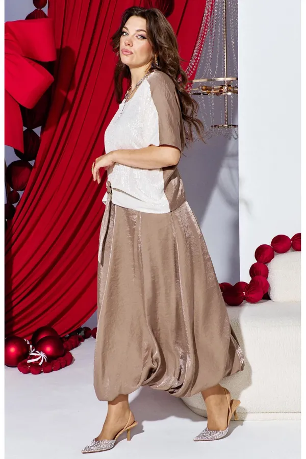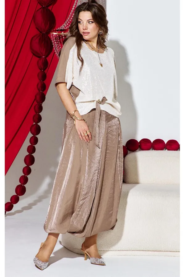 Комплект женский юбочный, двух-предметный, состоящий из блузы и юбки-балон. Комплект держится в гармонии за счёт контраста фактур: гладкая блуза с акцентной вставкой из отделочной ткани- светлой пайетки по переду и фактурным балоном юбки за счёт лёгкого перекрута по низу. Общий силуэт создаёт ощущение движения даже в статичном кадре. Этот наряд идеально подходит для торжественных мероприятий: он подчеркивает женственность, оставаясь при этом светлым и уверенным. Блуза свободного силуэта, с округлой формой горловины. Линия плеча в блузе переходит на перёд. По переду вставка из отделочной ткани- пайетки, от низа в качестве декоративного элемента заложена складка фиксирующаяся при помощи отделочной пуговицы и декоративной ленты из основной ткани. По спинки блузы отрезная кокетка. Рукав цельнокроеный, длиной ¾. В качестве дополнительного конструктивного элемента в блузе фигурные вставки « бочки». Юбка баллон, конической формы, расширяется к низу. По переднему и заднему полотнищу юбки фигурные подрезы переходящие в декоративные складки от низа, тем самым создавая необычный силуэт. Пояс в юбке притачной, со вставкой декоративной эластичной тесьмы-резинки в бочках. В среднем шве юбки застёжка на тесьму молнию и пуговицу по центру пояса. В боковых швах юбки карманы. Юбка на подкладке. Обращаем Ваше внимание, что фурнитура может незначительно отличаться от фото. Длина блузы 56 см (р 50-54), 57,5 см (р 56-60 см). Длина рукава (плеча) 39 см (р 50-54), 40 см (р 56-60 см). Длина юбки 95 см.