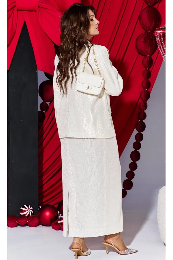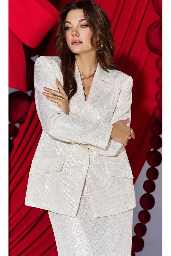 Это не просто женский юбочный костюм — это будто вторая кожа, сотканная из ночных огней и лунной пыли. Пайетки, бесчисленные и плотно прилегающие друг к другу, словно чешуя диковинной рыбы, не просто сверкали. Они жили своей собственной, мерцающей жизнью, рождая на своей поверхности целую вселенную из бликов. Костюм женский, двухпредметный, состоящий из жакета и юбки. Жакет однобортный, «оверсайз» силуэта, с акцентом на ровную линию плеч, с цельнокроеными отложными лацканами и потайной застёжкой на пришивные кнопки по краю борта. По переду жакета нагрудные вытачки и декоративные клапана карманов. Спинка в жакете со средним швом. Рукав в жакете втачной, одношовный, длинный. Жакет на подкладке. Юбка длины «миди», обтачная по верхнему срезу подкладкой. В среднем шве заднего полотнища юбки застёжка на декоративную тесьму-молнию в среднем шве. От низа юбки в среднем шве разрез. Юбка на подкладке.Длина по спинке жакета 71 см, длина рукава 62 см. Длина юбки 96 см.
