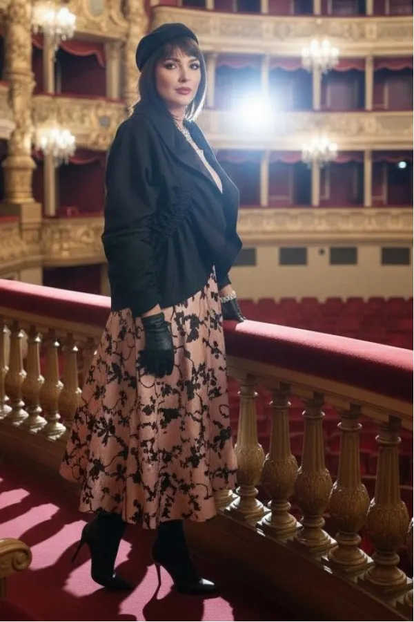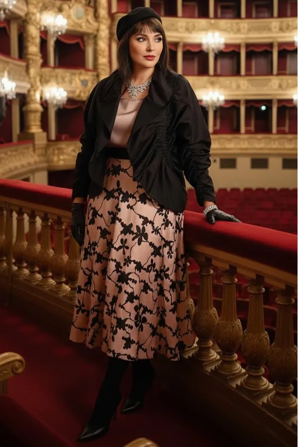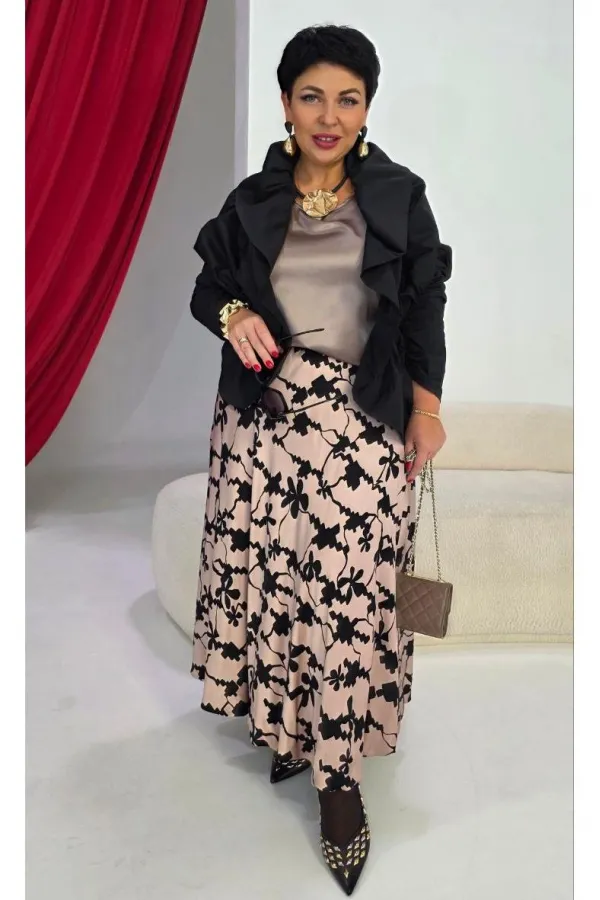 Женский комплект состоит из трёх элементов, каждый из которых дополняет другой, создавая гармоничную и современную образность. Жакет - «оверсайз» силуэта, выглядит свободной на силуэте, её пространство вокруг плеч и линии талии напоминает мягкую волну одежды, которая свободно дышит и передаёт непринуждённую уверенность. Декоративные резинки с эффектом сборки вдоль рукавов, по деталям переда добавляют игривую динамику. Он будто приглушённый акцент в ансамбле — она подчёркивает силуэт сверху без утяжеления, оставляя место для свободной игры ткани. Блуза в нежном бежевом оттенке, который гармонично сочетается с насыщенным чёрным цветом комплекта. Блуза прямого силуэта с округлой формой горловины и нагрудными вытачками по полочке. Спинка без особенностей. Низ в блузе фигурной формы. Юбка баллон из ткани с принтом, конической формы, расширяется к низу. Пояс в юбке притачной в виде декоративной эластичной тесьмы-резинки, а боковом шве застёжка на потайную тесьму-молнию. Юбка на подкладке. Длина спинки жакета 61 см, длина рукава 33 см. Длина блузки по спинке 63,5 см (р 48-52), 64 см (р 54-58), ширина плеча 8 см. Длина юбки 88 см (р 48-52), 89 см (р 54-58).