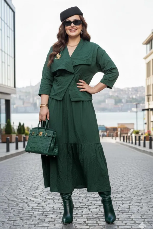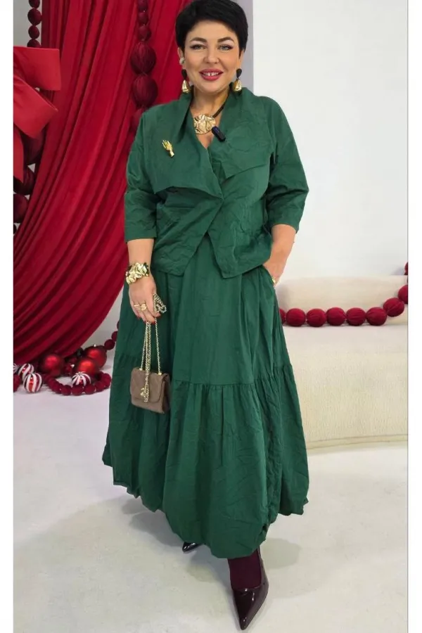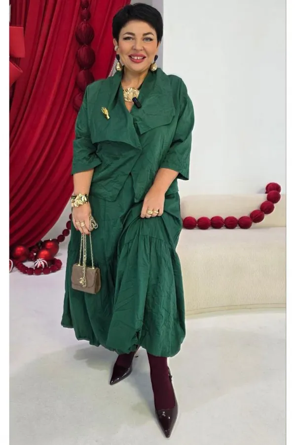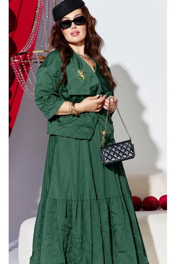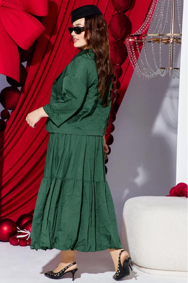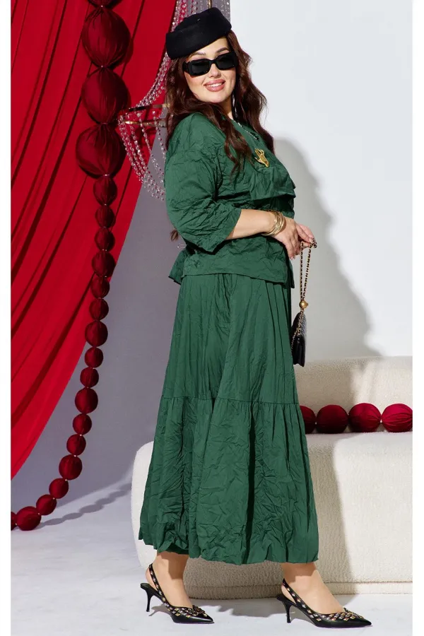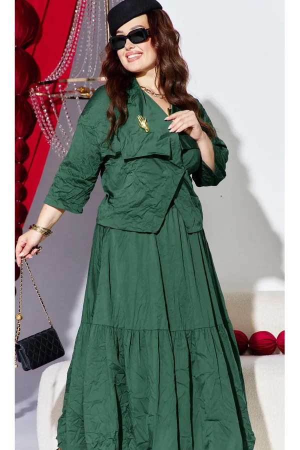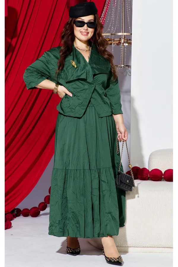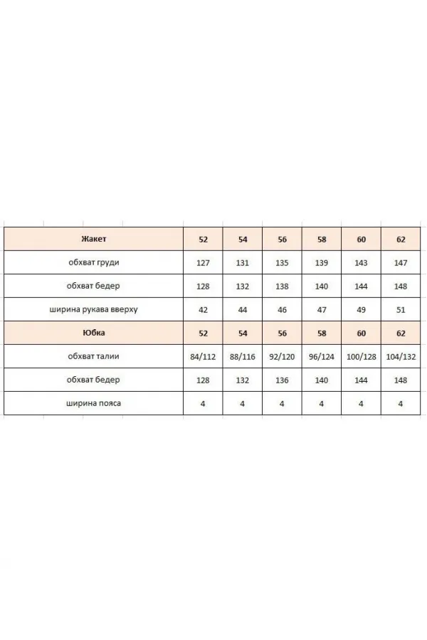 Костюм женский юбочный, состоящий из жакета и юбки. Жакет свободного силуэта с ассиметричной линией борта, с двубортной застёжкой на потайные кнопки. Воротник в жакете отложной, ассиметричный, с декоративно заложенной сладкой фиксирующейся декоративной брошью. По переду жакета декоративные листочки кармана. Спинка со средним швом. Линия плеча в жакете спущенная. Рукав втачной, длиной ¾. Юбка-баллон, трапециевидного силуэта с горизонтальным подрезом и сборкой. Пояс в юбке притачной с эластичной тесьмой-резинкой, что обеспечивает максимально удобную посадку на любой тип фигуры. В боковых швах юбки карманы. Юбка на подкладке. Обращаем Ваше внимание, что фурнитура может незначительно отличаться от фото. Длина жакета по спинке 56,5 см (р 52-56), 57,5 см (58-62). Длина юбки 83 см.