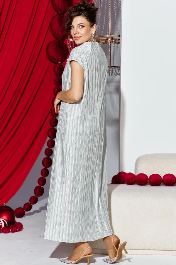 Платье прямого силуэта из фактурной ткани с крэш-эффектом, который создает в силуэте вертикальные заломы визуально вытягивающие фигуру и придает модели выразительный образ. Короткий рукав-реглан с навесными петельками и пуговицами, обтянутыми основной тканью рисует линию рельефа по переду и спинке сужая плечевой пояс. Платье на подкладке мягкое и удобное в движении. По спинке в среднем шве короткая потайная молния.