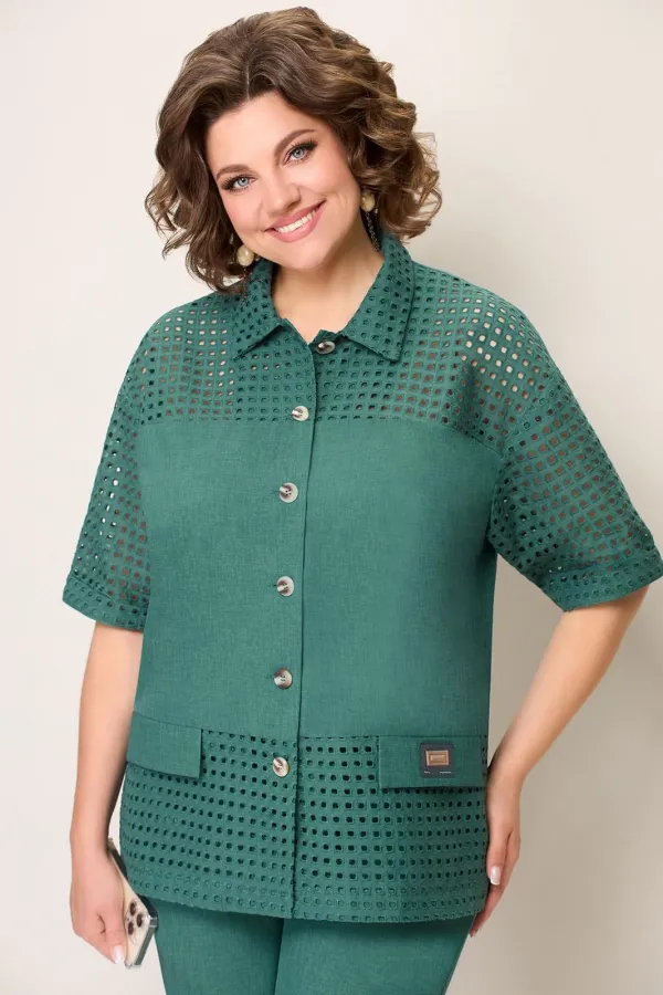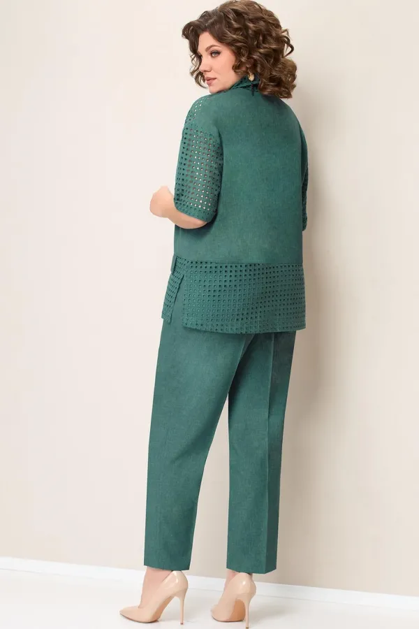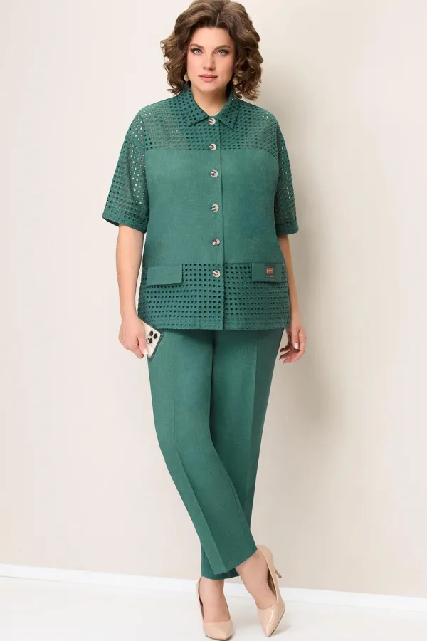 Блуза из легкого текстиля со вставками из хлопка-шитья.. Длина блузы по центру спинки- 67см. Рукав втачной, слегка спущенный . Длина рукава- 31 см.Брюки прямые с высокой посадкой, с притачным поясом на резинке. Длина брюк по боковому шву- 102см.