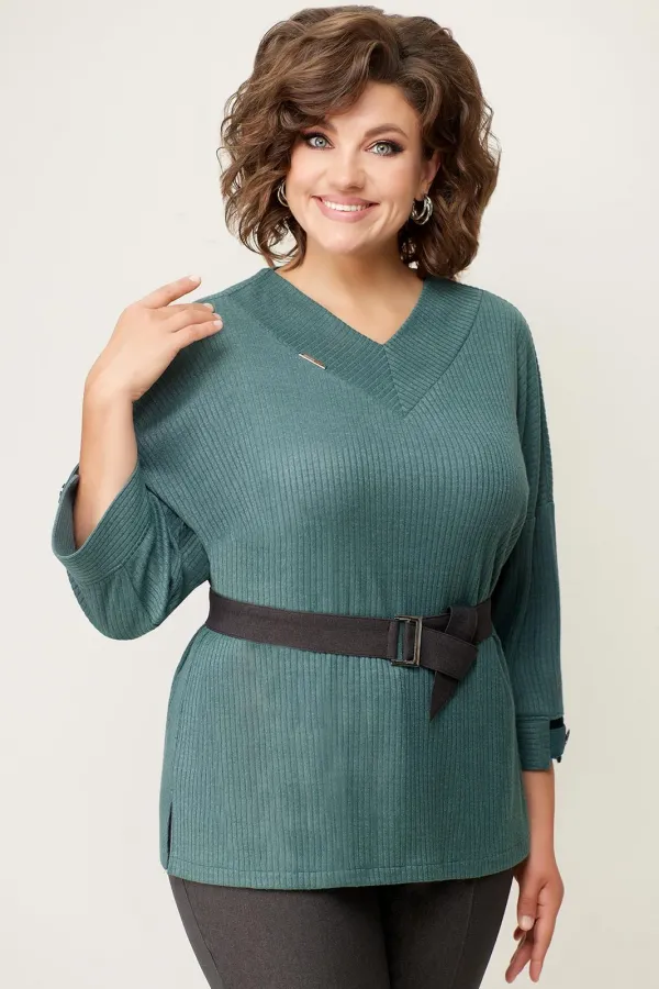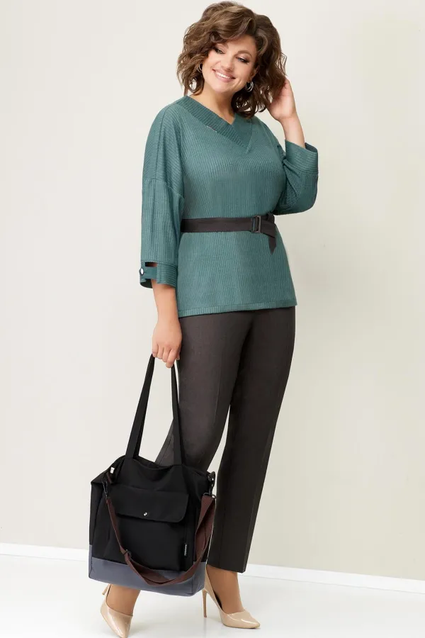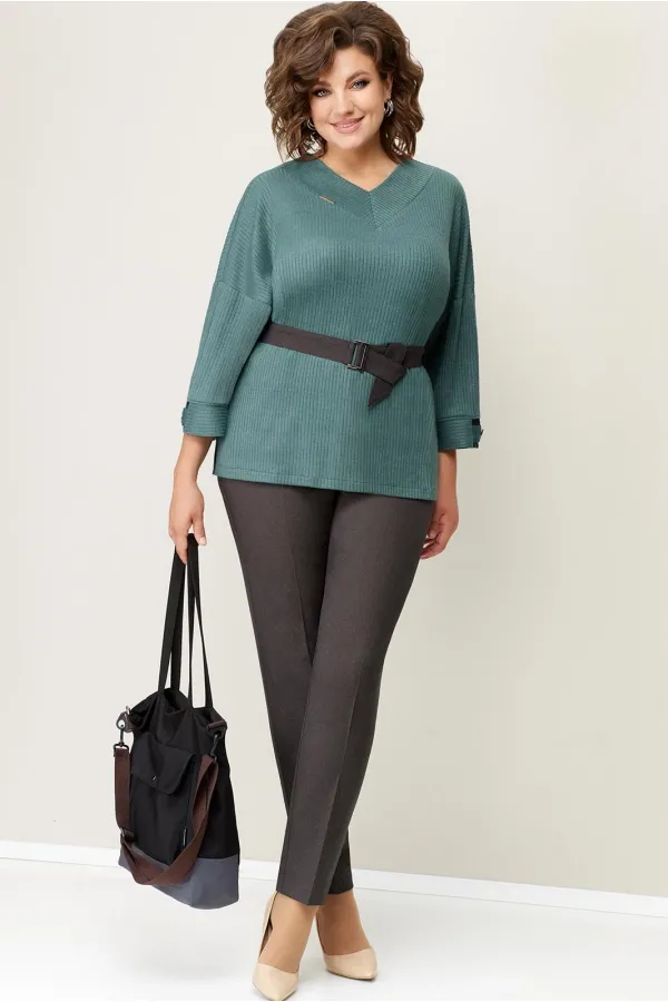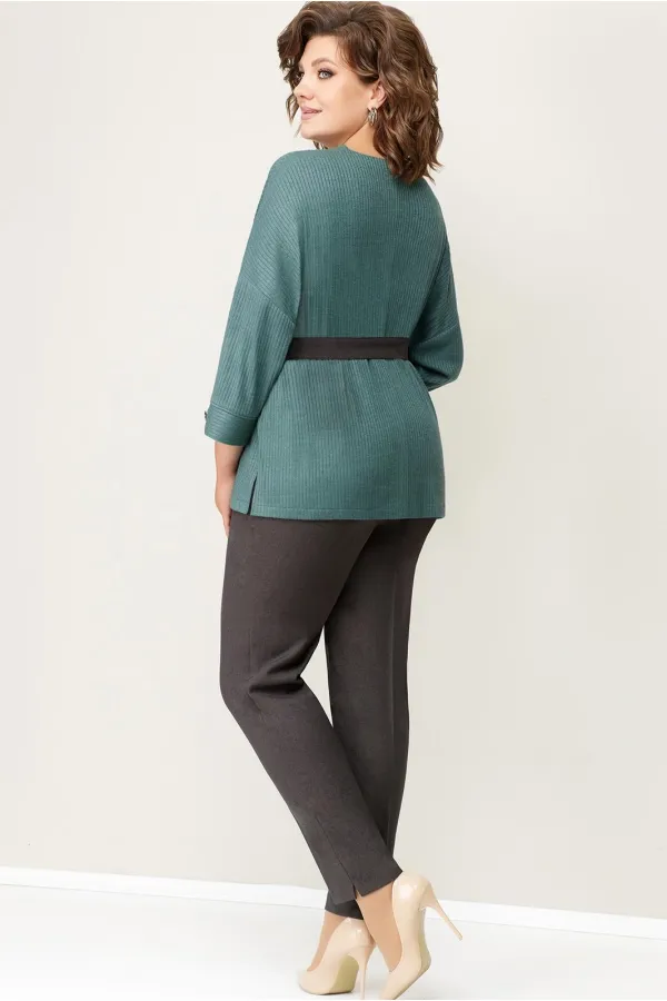 Джемпер с V-образным вырезом из мягкого трикотажа . Рукав свободный, цельнокроеный. Длина свитшота по центру спинки- 64 см. Прямые брюки из текстиля, с высокой посадкой, притачным поясом с резинками по бокам. Длина брюк по боковому шву- 100 см. Съемный пояс из текстиля - в комплекте изделия.