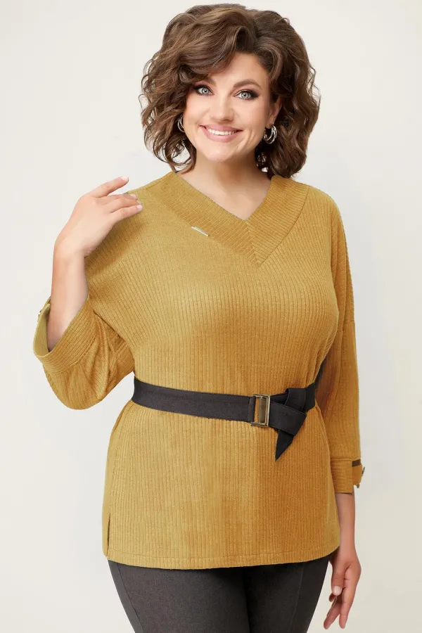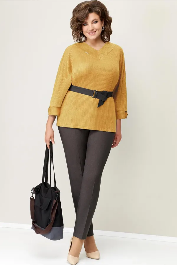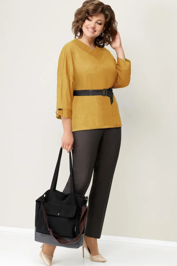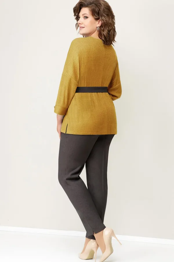 Джемпер с V-образным вырезом из мягкого трикотажа . Рукав свободный, цельнокроеный. Длина свитшота по центру спинки- 64 см. Прямые брюки из текстиля, с высокой посадкой, притачным поясом с резинками по бокам. Длина брюк по боковому шву- 100 см. Съемный пояс из текстиля - в комплекте изделия.