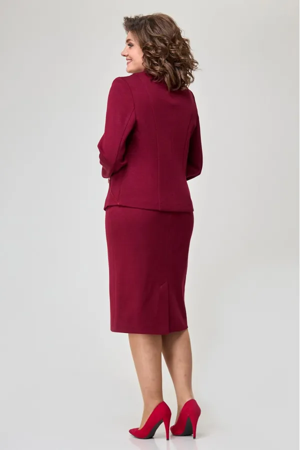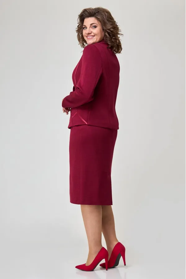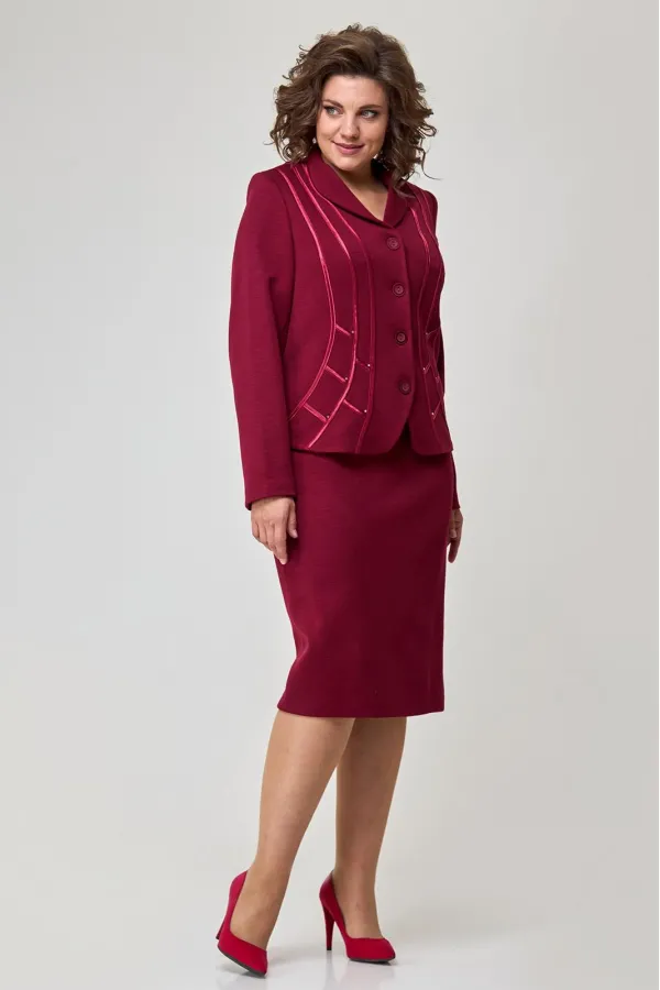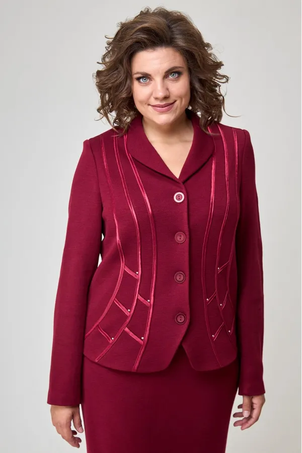 Повседневный трикотажный костюм, состоящий из жакета и юбки. Жакет полуприлегающего силуэта. Рукав втачной. По спинке средний шов, рельефы. Застежка на пуговицах. Спереди на подкладке. Отделка атласной тесьмой и стразами. Юбка прямого силуэта на подкладке. В поясе, по бокам от вытачки до вытачки с эластичной лентой. На заднем полотнище юбки средний шов со шлицей и застежкой на пуговицу и молнию. Пуговицы могут отличаться от представленных на фото. При подборе необходимого размера, используйте таблицу обмерных данных в готовом виде. Чтобы перейти в общий каталог моделей, нажмите на иконку бренда в карточке товара. Спасибо, что выбираете Zlata!