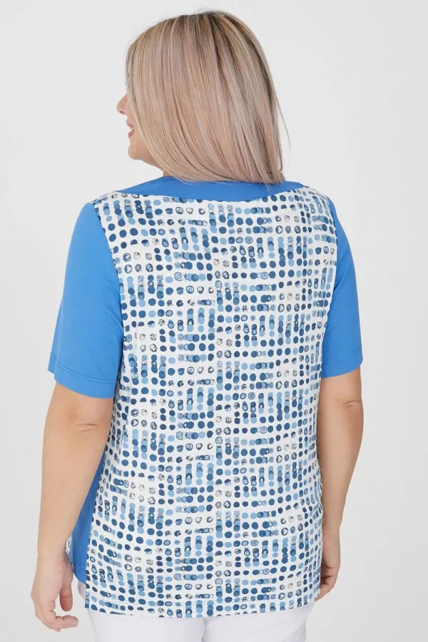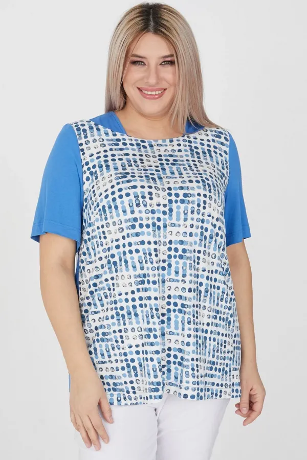 Красивая женская футболка от компании LUXURY PLUS. Стильная комбинированная футболка полуприлегающего силуэта. Основа выполнена из вискозного трикотажа в яркий принт. Прилегание по груди за счет вытачек. Вырез горловины фигурный, за счет кокетки по переду и спинке. Рукава втачные, укороченные. По боковому шву вставка, чуть короче основы. Рукава, кокетка и вставка по боковым швам выполнены из однотонного трикотажа, что делает модель интересной и расставляет акценты. Модель отлично сочетается с джинсами, брюками или юбками. Яркий и комфортный вариант для жаркого лета!