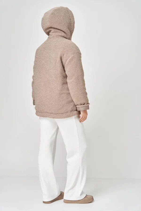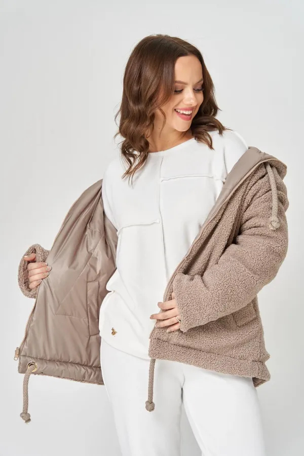 Куртка женская с центральной застёжкой на тесьму-молнию. Двусторонняя. Линия плеча спущена. Рукав втачной одношовный. По переду прорезные карманы с листочкой. Капюшон с центральной частью , по отлету-кулиса. По низу изделия - кулиса. Используется две ткани. Одна сторона простёганная плащёвка, вторая сторона искусственный мех. Длина по спинке 70 см. , длина рукава 56 см.Параметры изделия в готовом виде представлены на фото.
