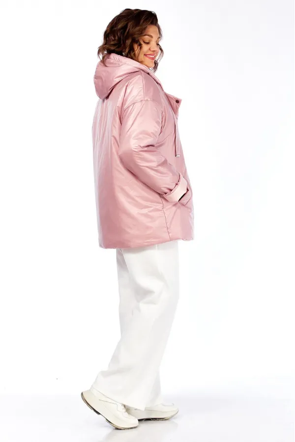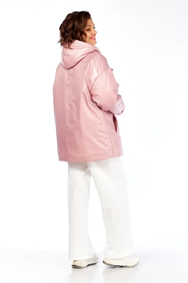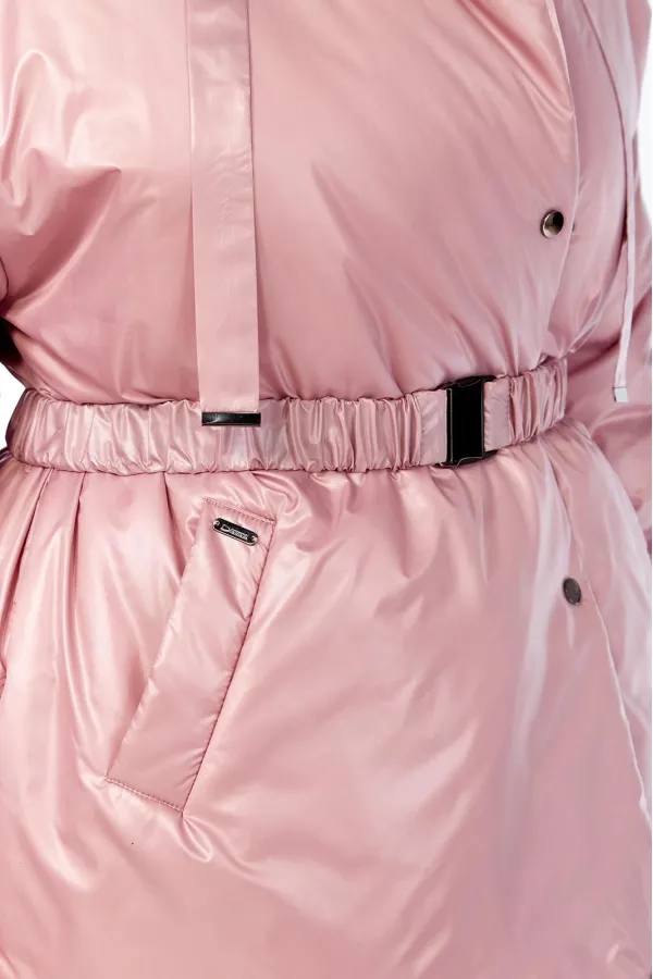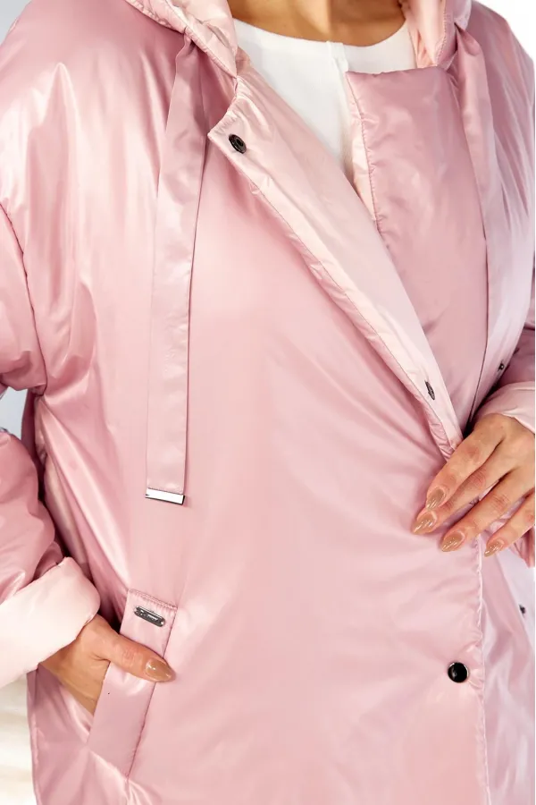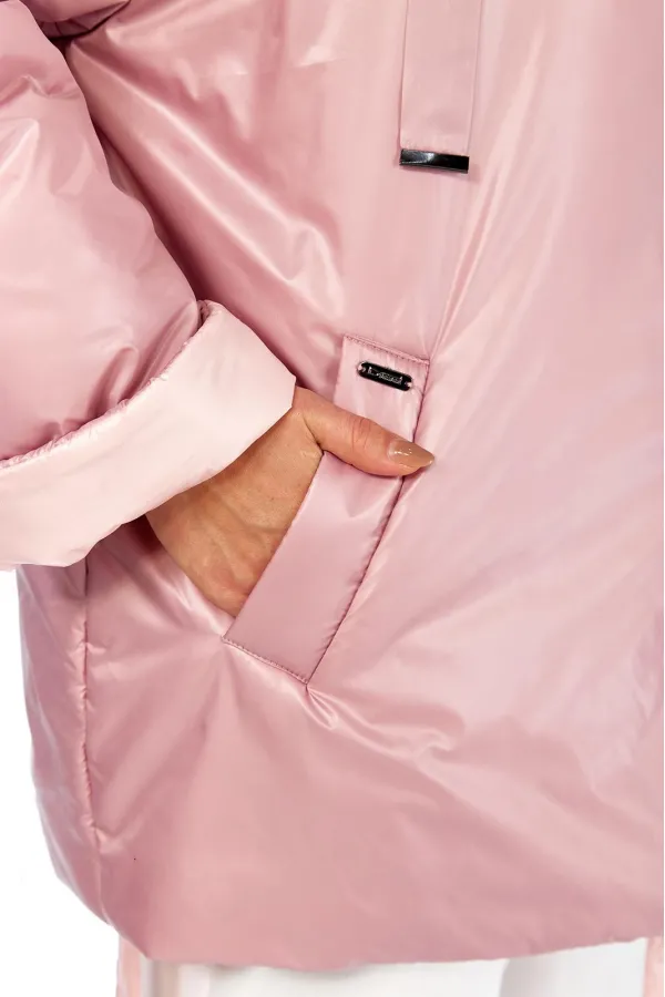 Куртка женская двухсторонняя с центральной бортовой застежкой на кнопки. Спинка простая. Перед с боковыми карманами с одной стороны с листочкой, а внутренняя сторона с карманами в боковых швах. Рукав втачной одношовный со спущенной линией плеча. Воротник-капюшон с кулисой. Есть пояс на резинке с застежкой на пряжку. Куртка утепленная. Температурный режим до - 10 градусов. Фурнитура может отличаться от заявленной на фото.