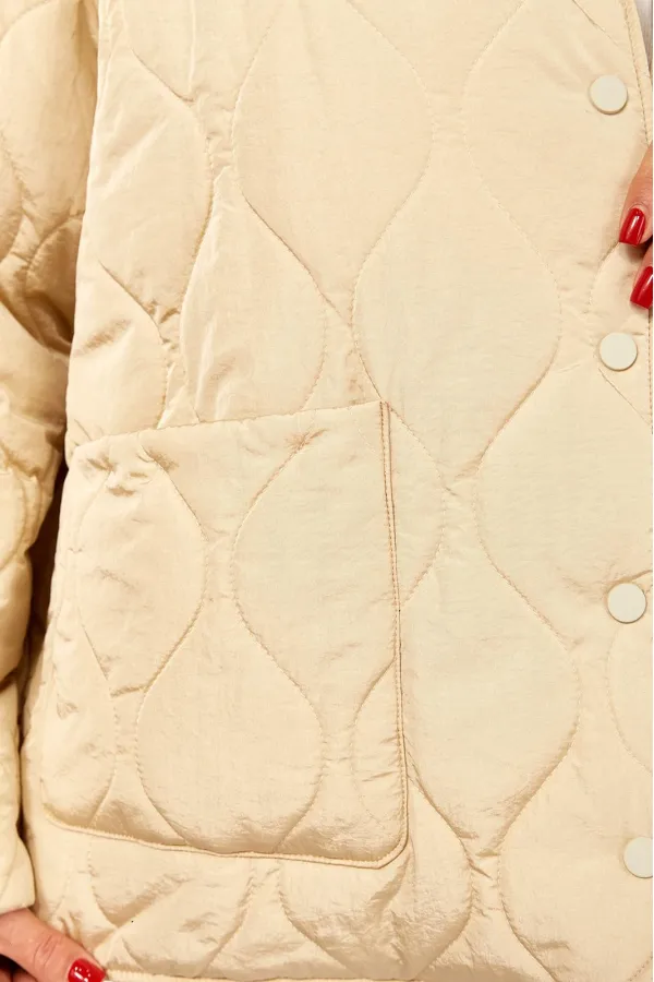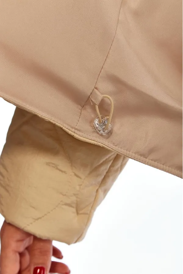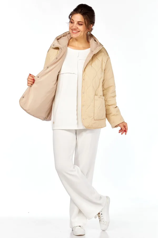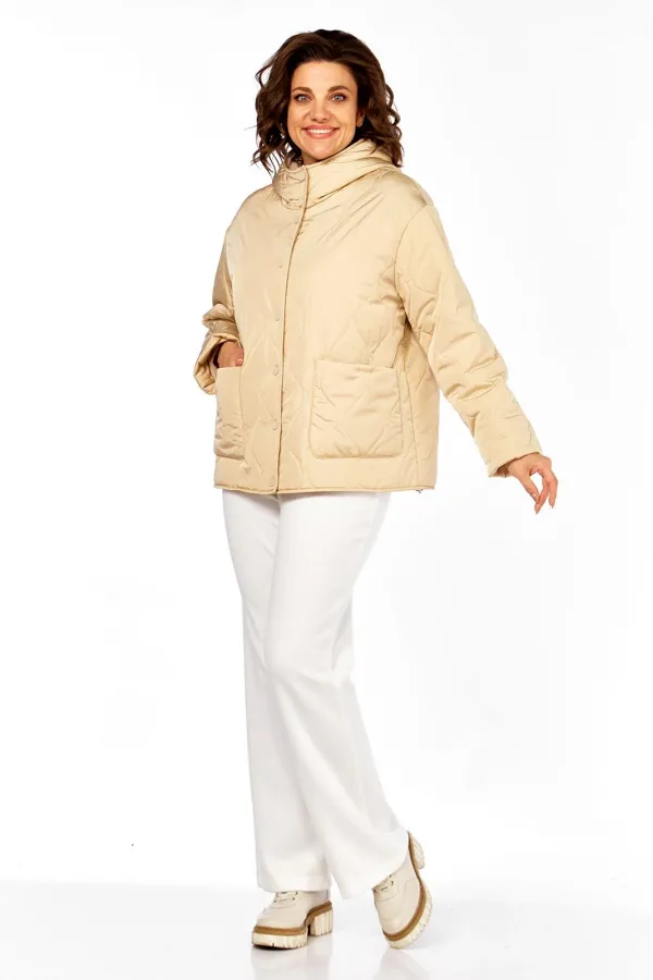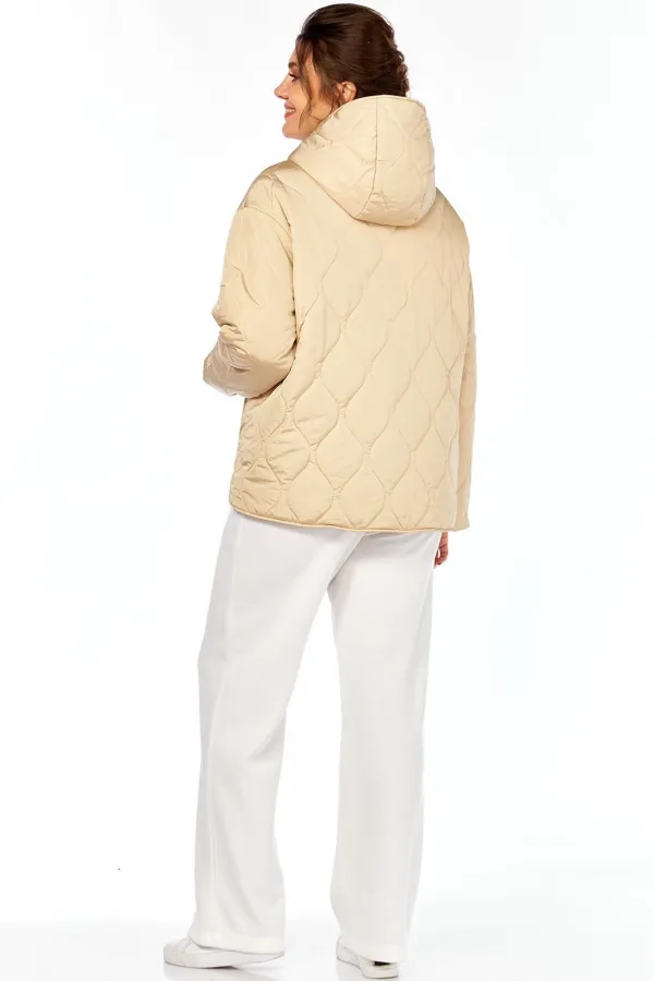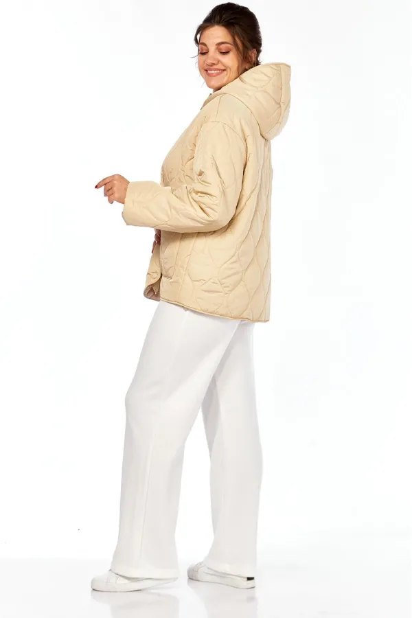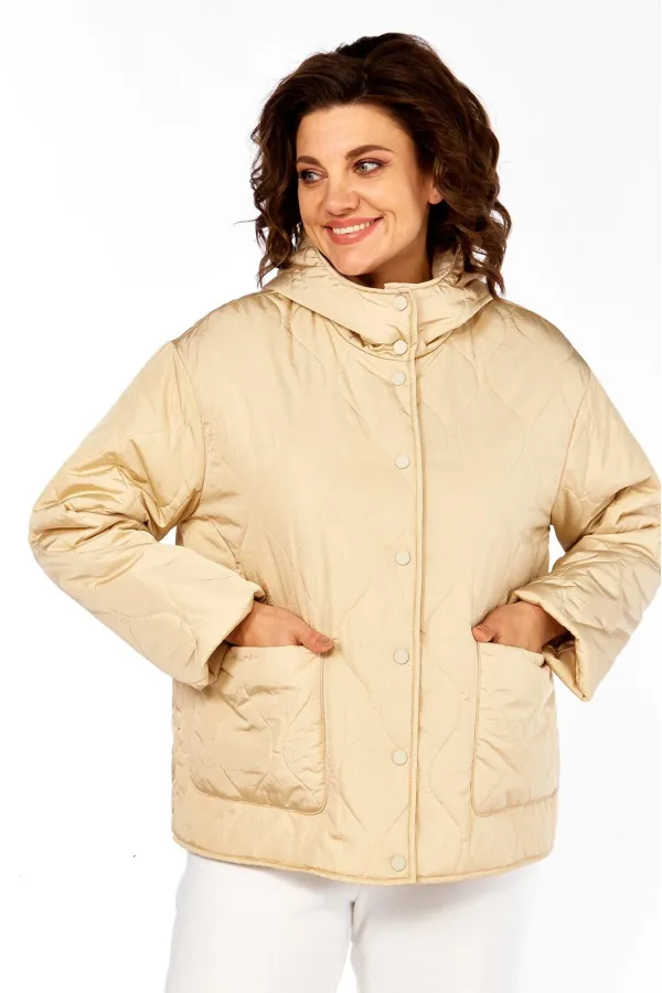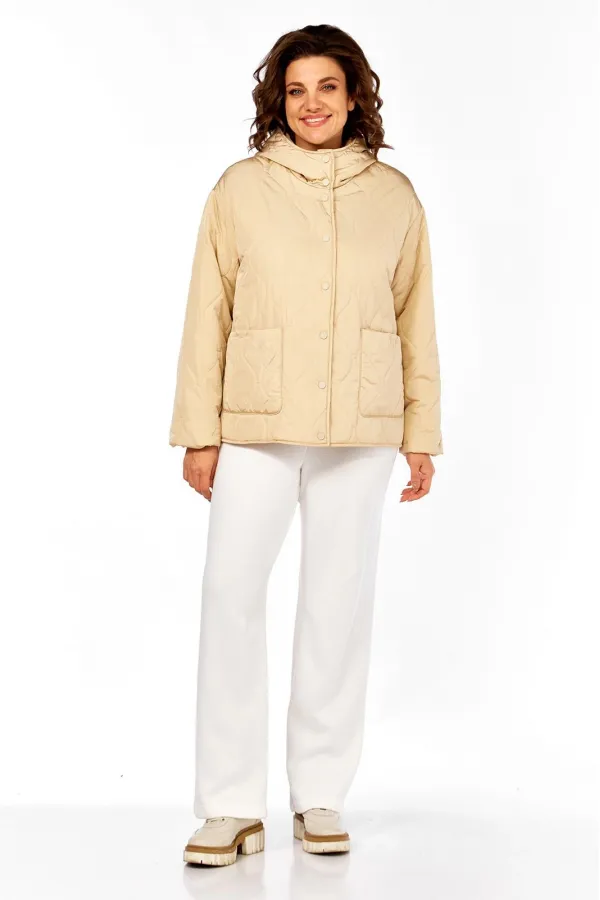 Куртка женская с центральной бортовой застежкой на кнопки. Спинка простая. Перед с боковыми накладными карманами. Рукав втачной одношовный с широкой подгибкой. Воротник-капюшон с центральной и боковыми частями и застежкой на 2 кнопки. Куртка на подкладке. Длина по спинке 70 см. Длина рукава 56 см.
