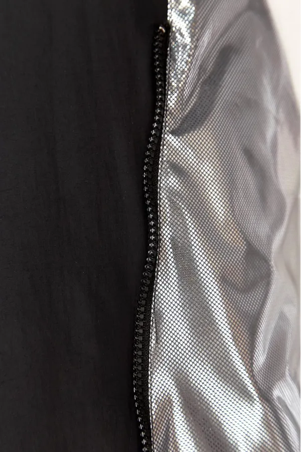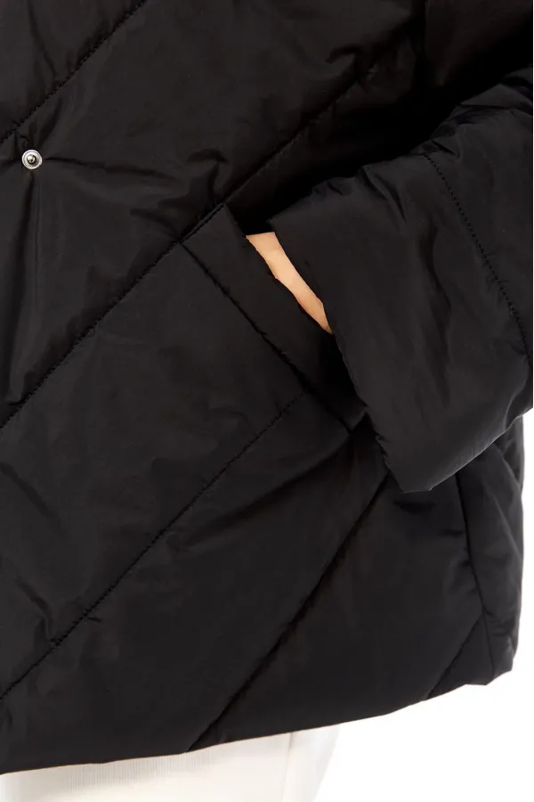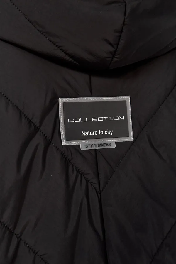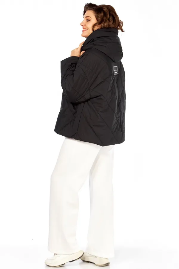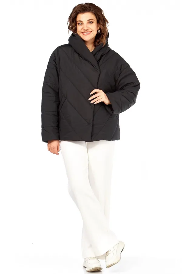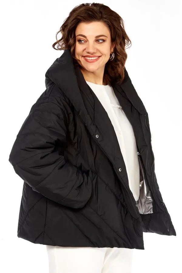 Куртка женская свободного кроя, со спущенной линией плеча, со смещенной потайной застежкой на тесьму-молнию и кнопки. По спинке средний шов, по переду-прорезные карманы с настрочной листочкой. Рукав втачной одношовный. Объемный капюшон с центральной частью и отделочной деталью по отлету. В качестве отделки используется фурнитура. Утеплитель изофит 150 гр. Температурный режим до -5 градусов.Длина по спинке 65 см, длина рукава 53 см.