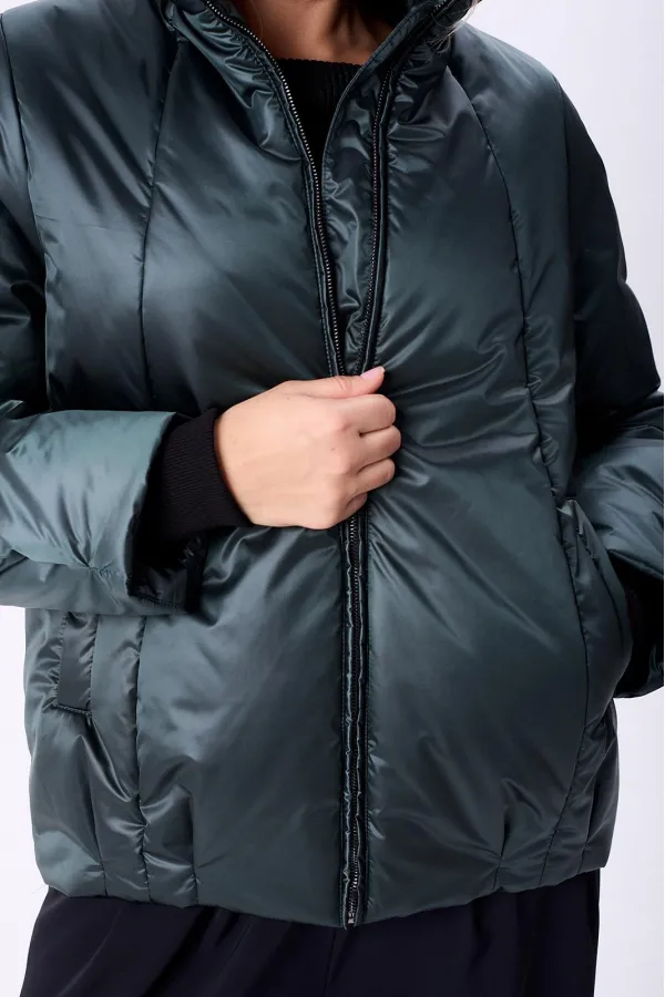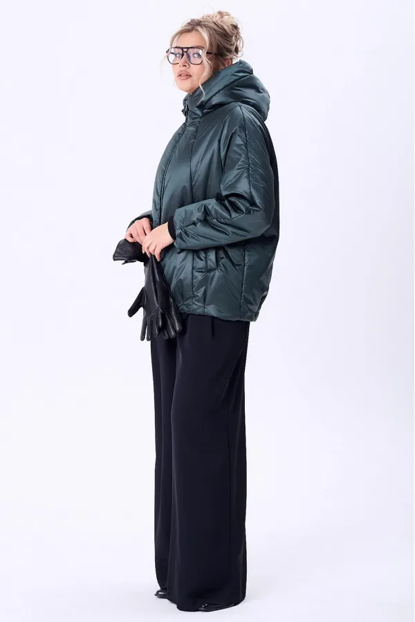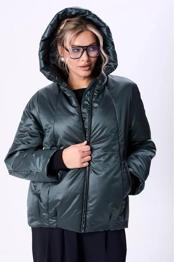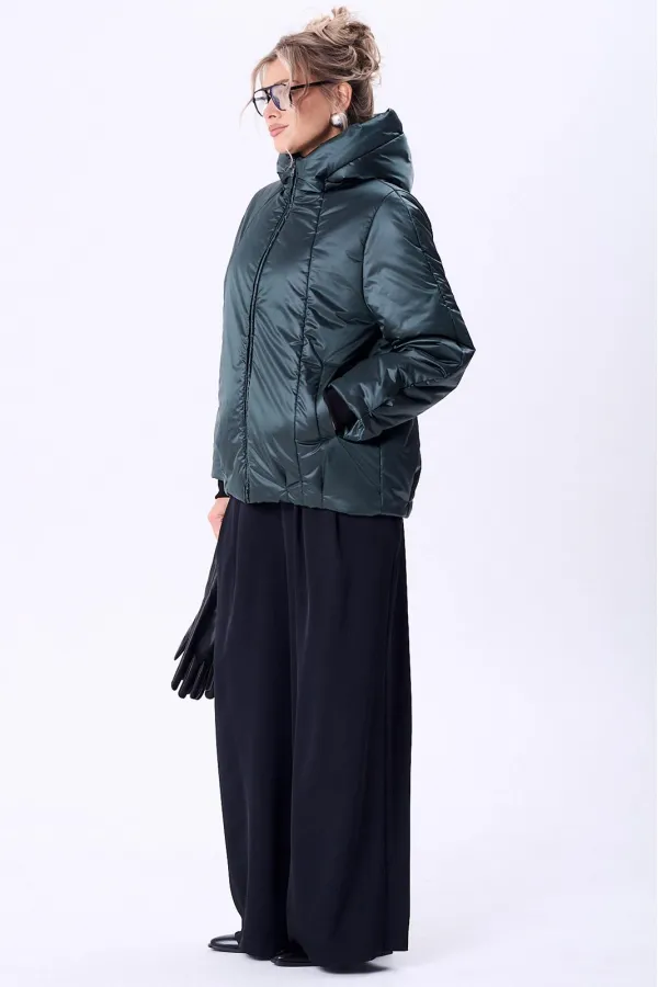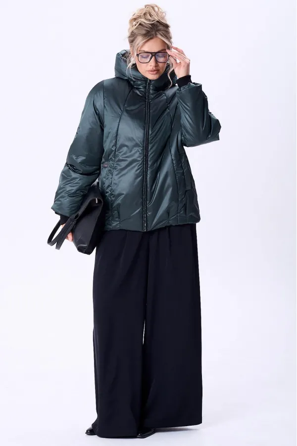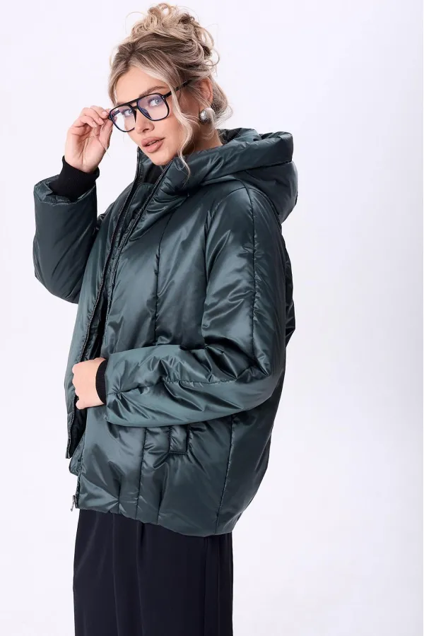 Куртка женская с центральной застежкой на тесьму-молнию. По спинке рельефные швы от горловины до низа, по низу заложены складки. По переду рельефные швы от горловины до низа, по низу заложены складки, обработаны карманы с втачной вытачкой. Рукав полуреглан 2шовный. Капюшон с центральной частью и отделочной деталью по отлету. В качестве отделки используется фурнитура. Утеплитель синтепон 150 гр.Длина по спинке 73 см. Длина рукава 65 см.