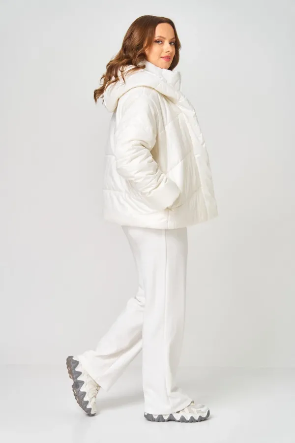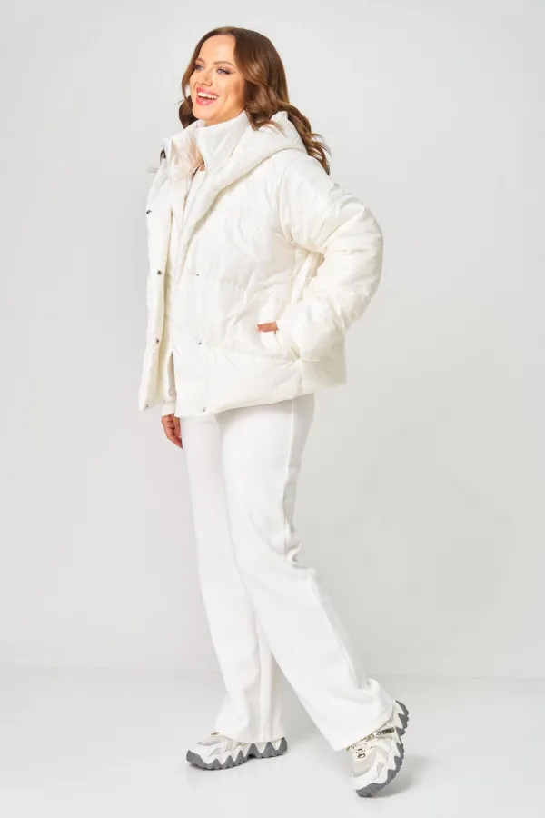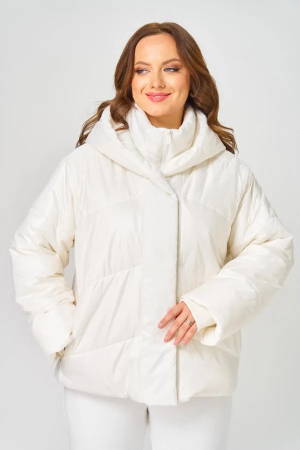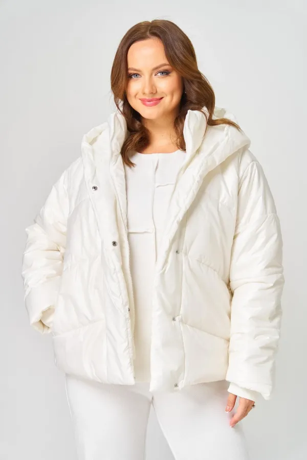 Куртка женская с центральной застёжкой на молнию и потайные кнопки. Спинка с горизонтальной стяжкой. Полочка выстегана по косой. В бококвых швах обработаны карманы. Рукав втачной одношовный с трикотажными манжетами из-под подгибки. Воротник-капюшон переходящий в планку с кнопками. Внутренний воротник-стойка с манишкой на молнии. Куртка на утеплителе. Температурный режим до - 10 градусов.