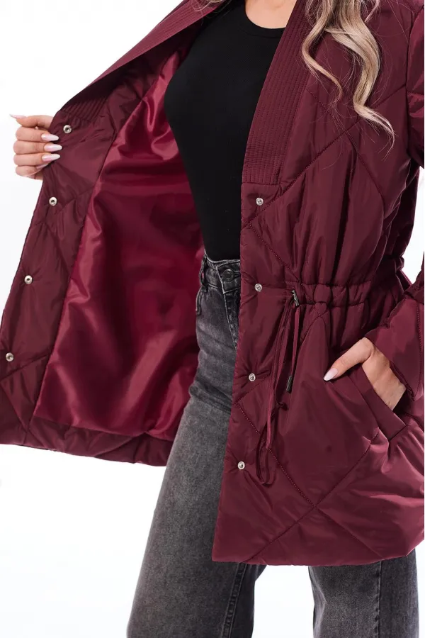 Куртка утепленная, с центральной застежкой на кнопки, втачным воротником, V-образным вырезом горловины. На полочках расположены прорезные карманы с листочками. На линии талии расположена кулиса со шнуром. Толщина синтепона 150г/м2, , изделие рекомендуется до -5 градусов.