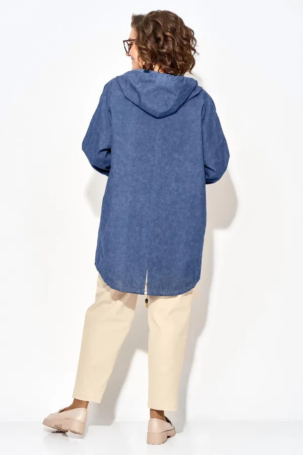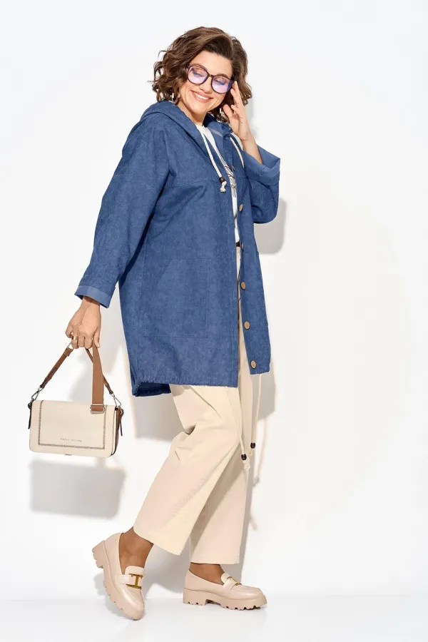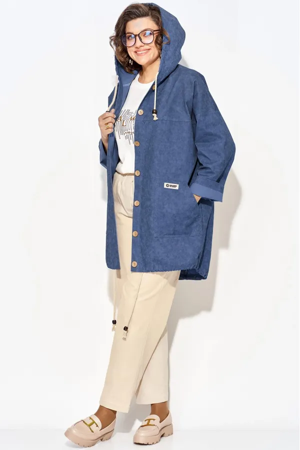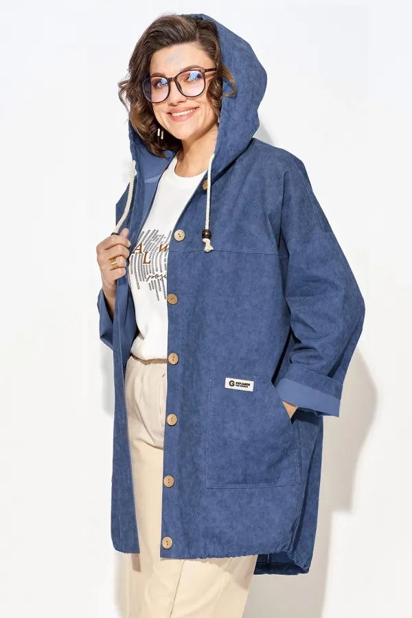 Женская джинсовая парка-ветровка, выполнена из 100% хлопка с эффектом водоотталкивающей пропитки. Удлиненная джин совка силуэта оверсайз очень практична и удобна, смотрится необычно и элегантно. Модель с объемным капюшоном является очень популярной в предстоящем сезоне. Застежка центральная на петли и пуговицы. Рукав длинный на спущенном плечевом поясе обеспечивает идеальную посадку по фигуре. По полочке расположена кокетка и накладные карманы с отделочными строчками. Спинка с центральным швом, переходящим в разрез. Низ изделия фигурный с утяжкой на шнуровку с наконечниками.