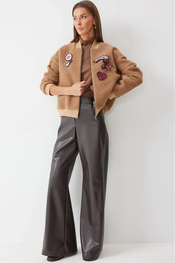 Жакет прямого силуэта из трикотажного полотна. Горловина-стойка, по центру застежка на молнию. Рукав со спущенной линией плеча, по низу манжета. По переду карманы с декоративными листочками. Жакет без подкладки. В комплект входит съемный декор. Обращаем ваше внимание, что фурнитура может отличаться от фото.