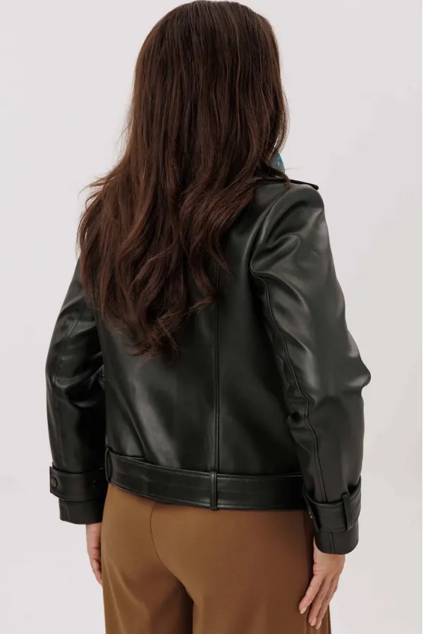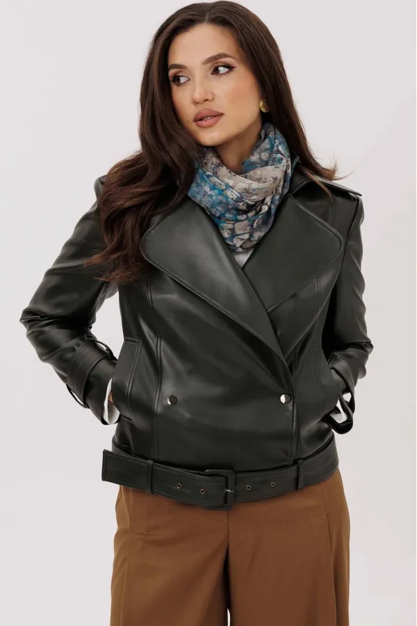 Жакет женский, укороченная, прямого силуэта на подкладке, выполнена из качественной экокожи. Застёжка двубортная на кнопки. По переду рельефы от плеча до низа и прорезные карманы с листочкой. Спинка с рельефами от плеча до низа. По низу куртки приточная планка со шлёвками, в которые продет пояс с пряжкой. Воротник отложной на стойке. Рукава двух шовные втачные, по низу паты продеты в шлёвки на кнопках.