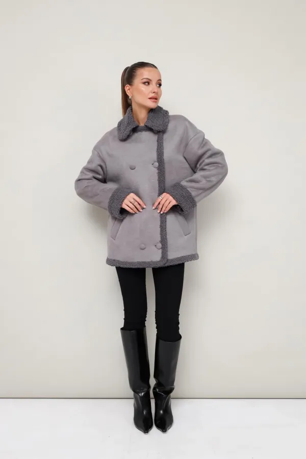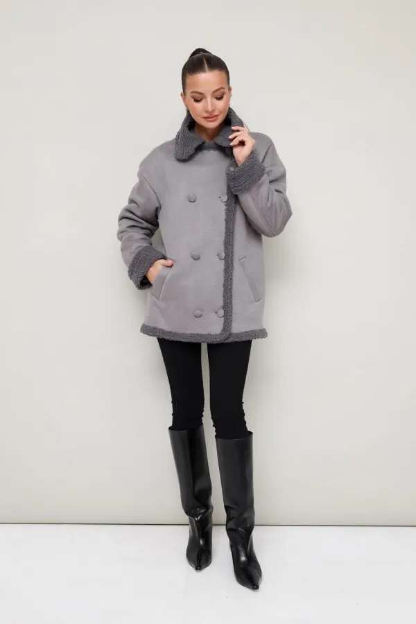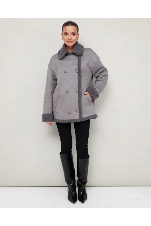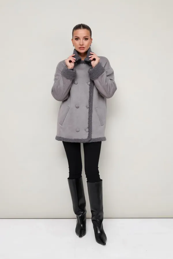 Женская дубленка прямого силуэта, длиной до середины бедра. Воротник и лацканы отложные. Застёжка двубортная на петли и обтяжные пуговицы. Спереди обработаны функциональные карманы с листочкой. Спущенная линия втачивая плеча, длинные двухшовные рукава с отворотом. Спинка с отрезной кокеткой. Дубленка декорирована искусственным мехом, который придает образу благородную мягкость и уют.