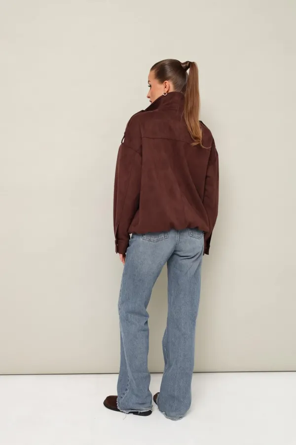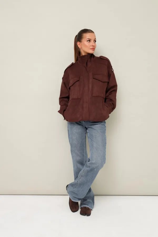 Бомбер актуального прямого кроя, выполнена из качественной экозамши. Воротник-стойка, центральная застёжка на молнию с притачной планкой. По плечевым швам паты. Спереди обработаны нагрудные накладные карманы с клапанами ... Читать далее...