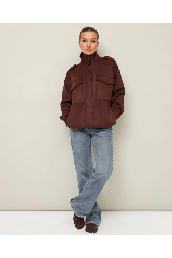 Бомбер актуального прямого кроя, выполнена из качественной экозамши. Воротник-стойка, центральная застёжка на молнию с притачной планкой. По плечевым швам паты. Спереди обработаны нагрудные накладные карманы с клапанами и прорезные карманы с листочкой. Рукава со спущенной линией втачивания плеча, по низу манжеты. Низ бомбера на резинке. Паты, центральная притачная планка и манжеты с застежкой на потайные кнопки. Спинка с кокеткой и средним швом. Бомбер на подкладке.