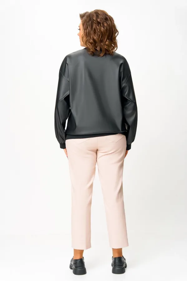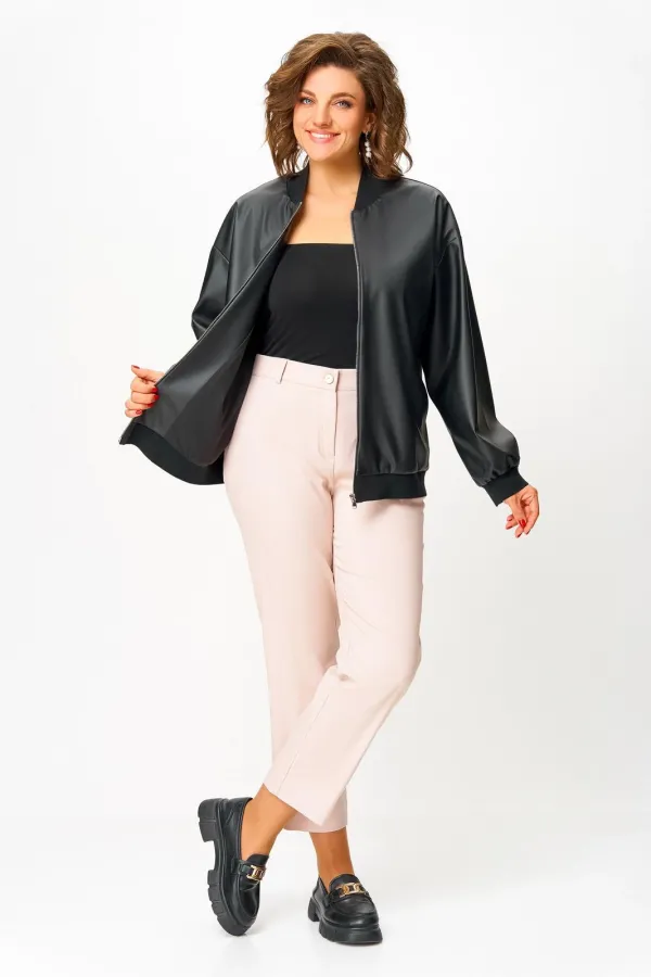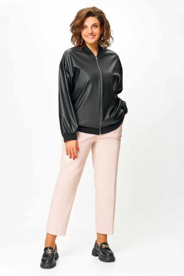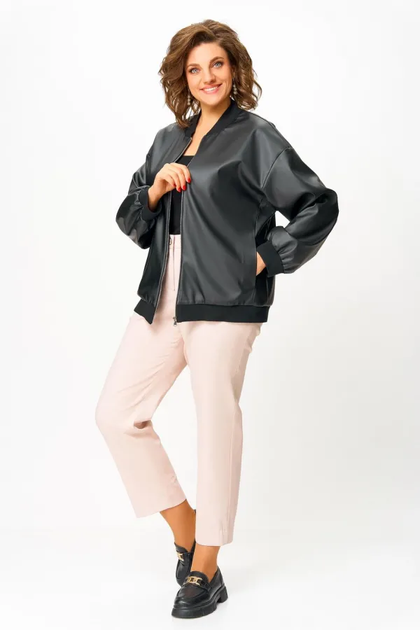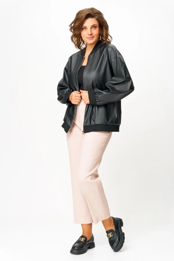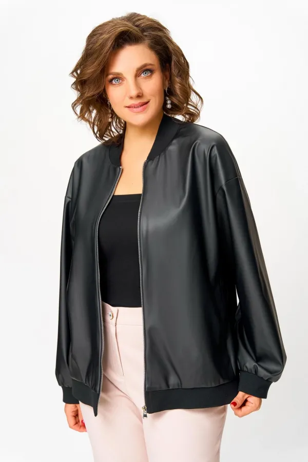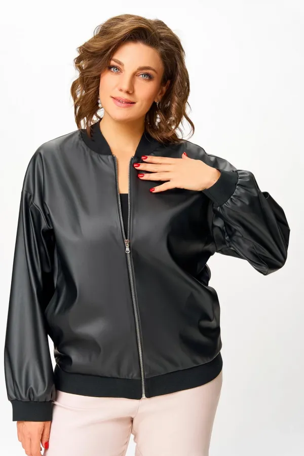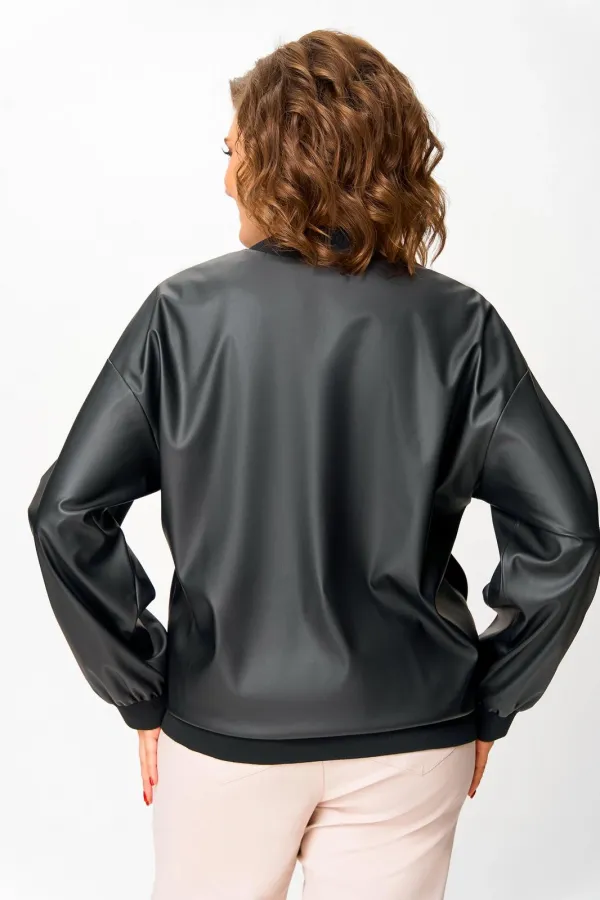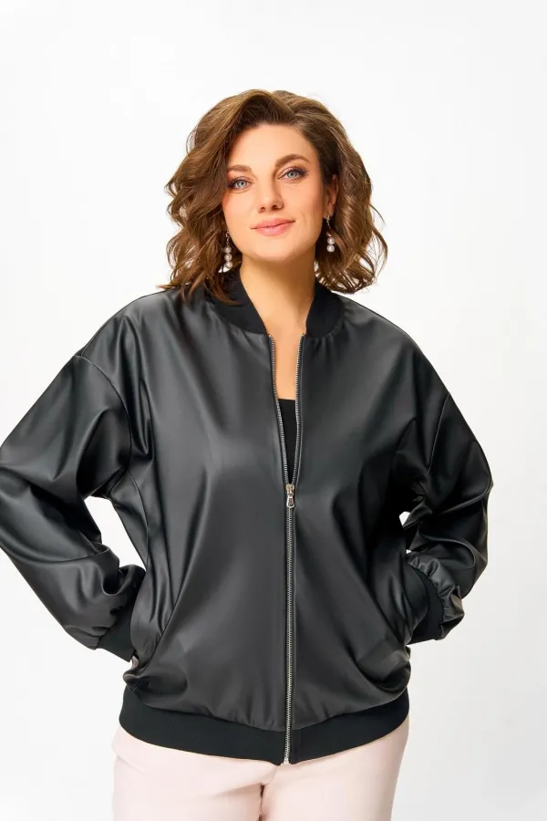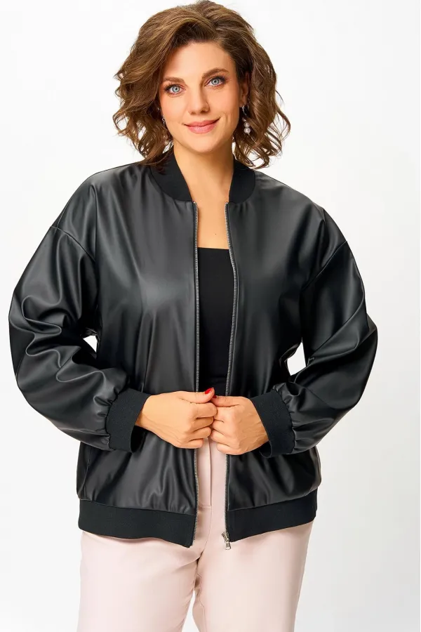 Бомбер женский из мягкой экокожи на подкладке свободного кроя со спущенной линией плеча и с центральной застёжкой на декоративную металлическую молнию. Полочка с отрезными бочками и карманами в швах. Горловина округлая со стойкой из трикотажного довяза. Рукав длинный. По низу рукава и изделия - довяз.