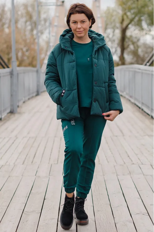 Комфортная женская куртка прямого силуэта с рукавом реглан, по низу рукав чуть присборен. Спереди наклонные карманы листочки. Один рукав задекорирован отделочной нашивкой. Застежка однобортная на потайные. Горловина оформлена капюшоном, спереди переходящим в стойку. Спинка без особенностей. Куртка на подкладке и на утеплителе H O O P O N, выд. температурный режим -15 C. Длина куртки-46-50 размер-68 см, 52-56 размер-73 см. Длина рукава- от плеча -80 см.