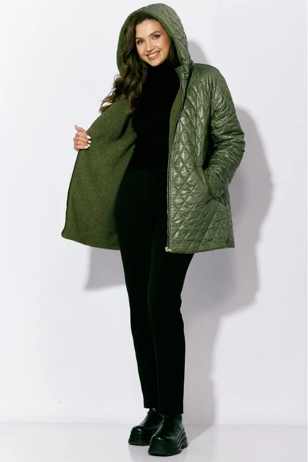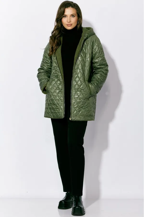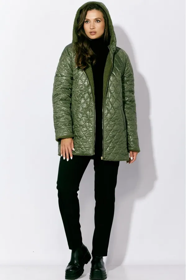 Куртка женская, демисезонная. Верх куртки - плащевка, стеганная на синтепоне. Подкладка - экомех барашек. Куртка прямого силуэта с длинным рукавом реглан. Длина рукава может регулироваться отворотом. По переду центральная застежка на молнию и прорезные, функциональные карманы. Горловина оформлена капюшоном-стойкой по переду.
