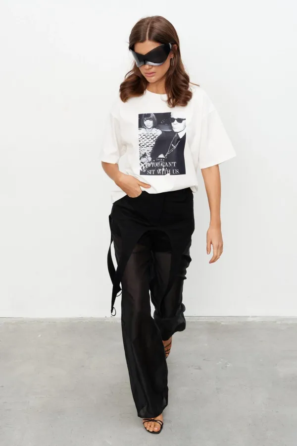 Оверсайз футболка из плотного трикотажа с контрастным принтом «Карл». Линия плеча спущена, горловина отделана эластичной бейкой.