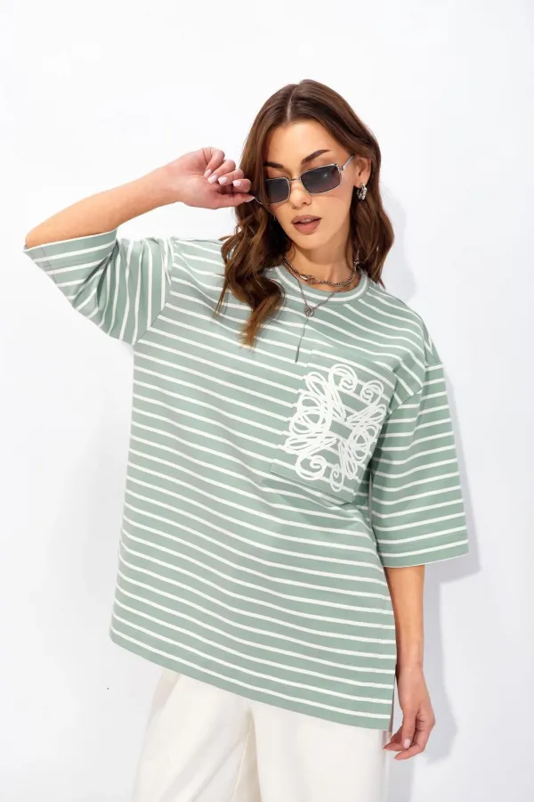 Джемпер прямого свободного силуэта со спущенной линией плеч из хлопкового трикотажного полотна в полоску. Вырез горловины округлый с притачной бейкой. По бокам высокие разрезы до талии. На кармане фактурная дизайнерская печать.