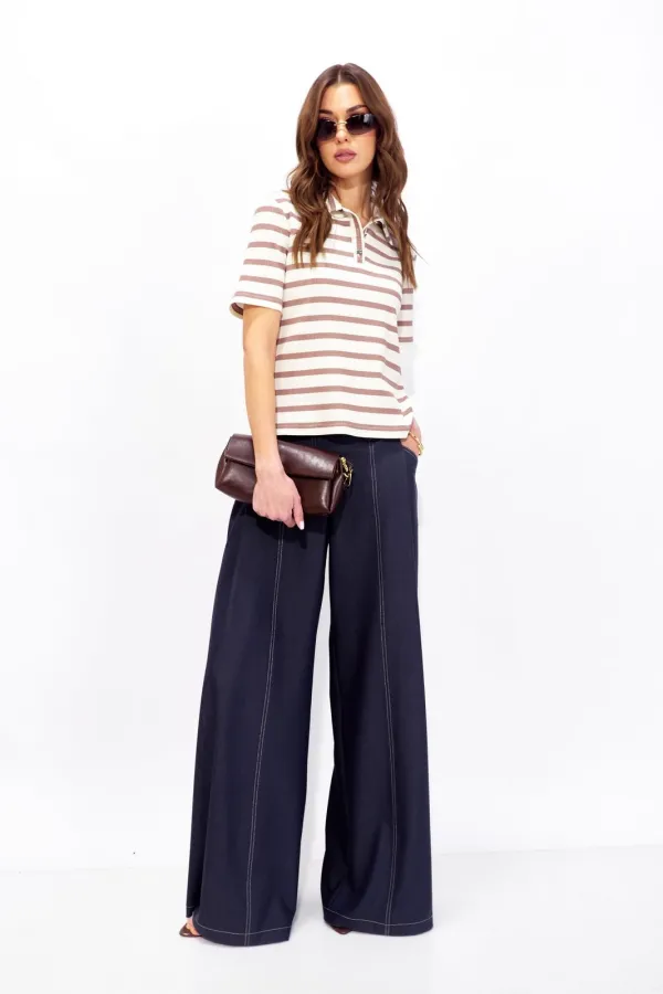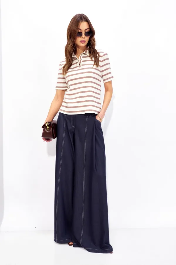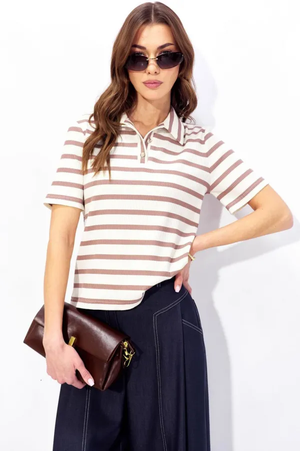 Джемпер полуприлегающего силуэта из трикотажного полотна в полоску. Воротник стояче-отложной, по центру застежка на петли и пуговицы. Рукав втачной, одношовный, выше линии локтя. Обращаем ваше внимание, что фурнитура может отличаться от фото.