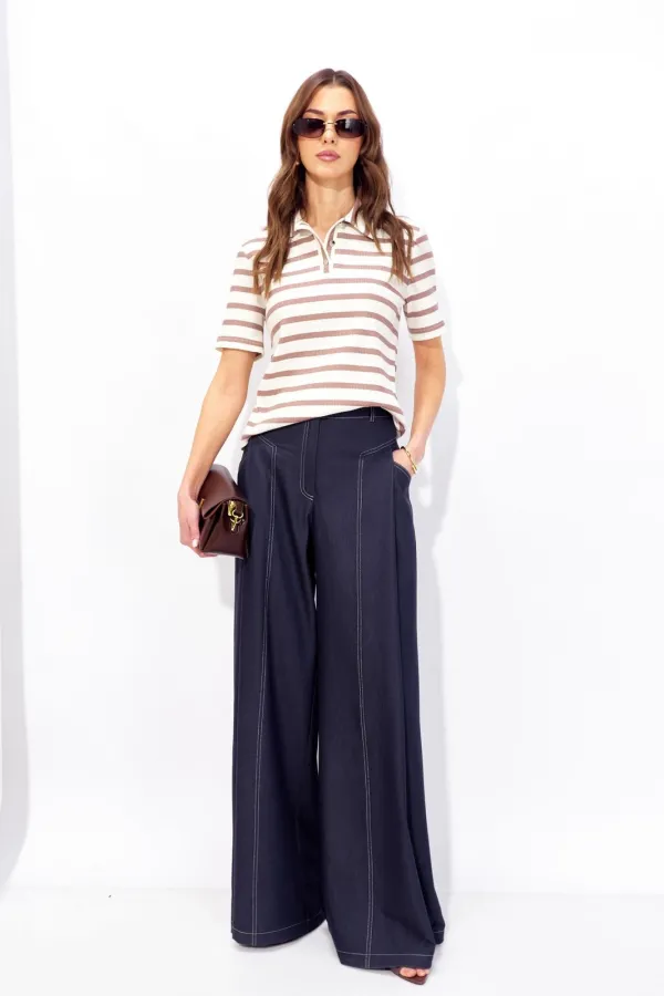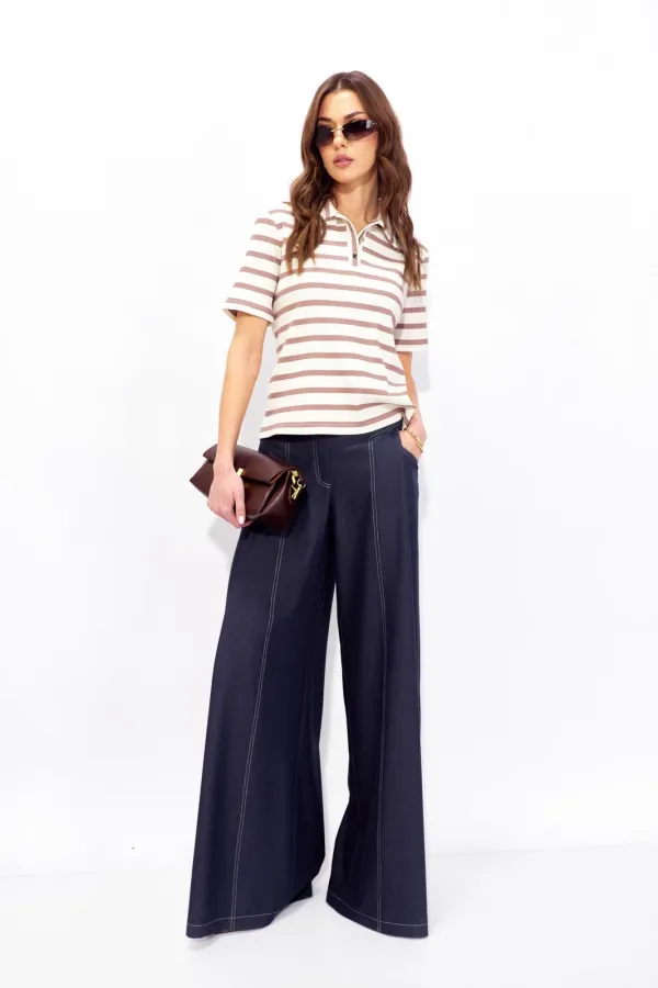 Джемпер полуприлегающего силуэта из трикотажного полотна в полоску. Воротник стояче-отложной, по центру застежка на петли и пуговицы. Рукав втачной, одношовный, выше линии локтя. Обращаем ваше внимание, что фурнитура мож... Читать далее...