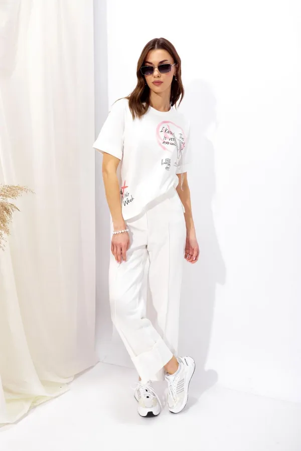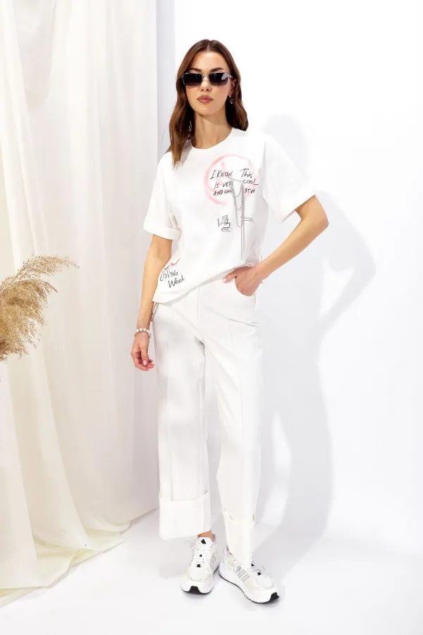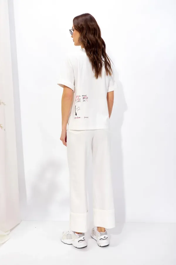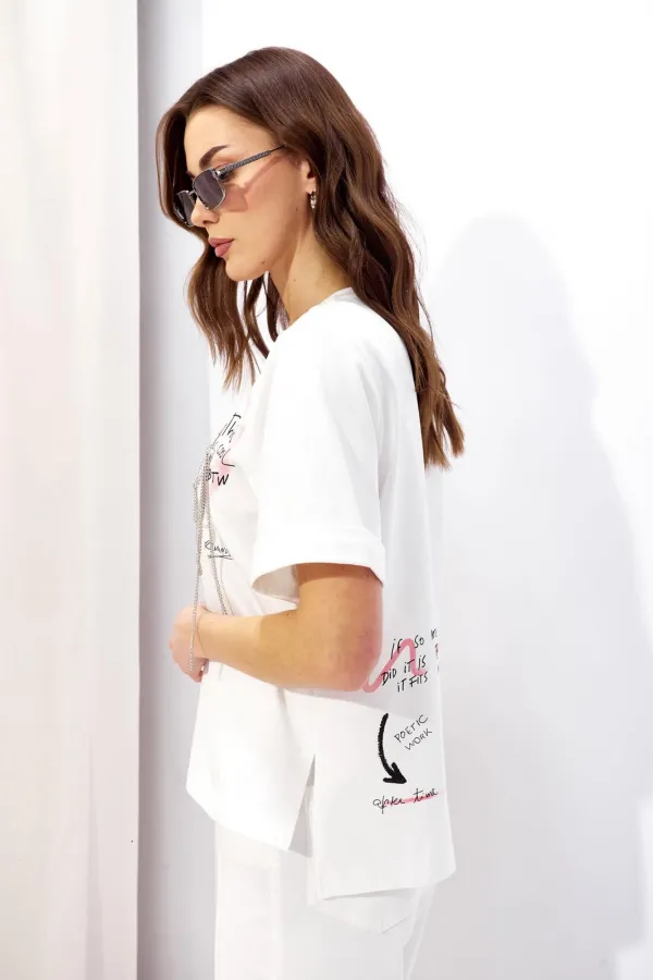 Джемпер прямого силуэта из трикотажного полотна. Горловина округлая. Рукав втачной, по низу манжета. По бокам разрезы, спинка длиннее переда. По переду и спинке дизайнерская печать. В комплект входит съемный декор.