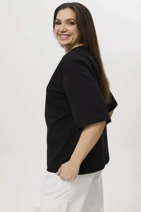 Перед цельный с дизайнерской вышивкой волна. Горловина округлая, обработана бейкой. Рукав длиной по локоть, одношовный, линия плеча немного спущена. Спинка цельная.