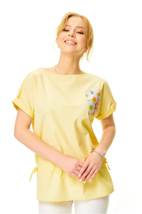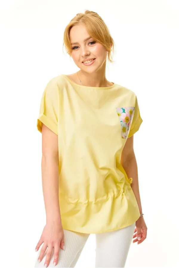 Блуза свободного силуэта. Горловина овальная, рукав цельнокроеный короткий с манжетой. Верхняя часть переда декорирована цветной термопечатью. По бокам невысокие разрезы. Ниже линии талии кулиска, шнур завязывается по бокам.