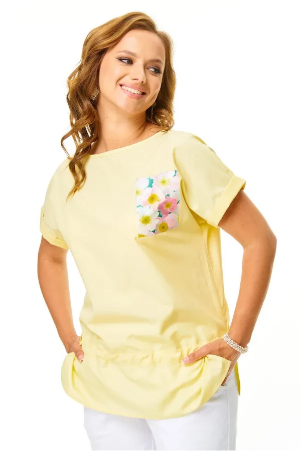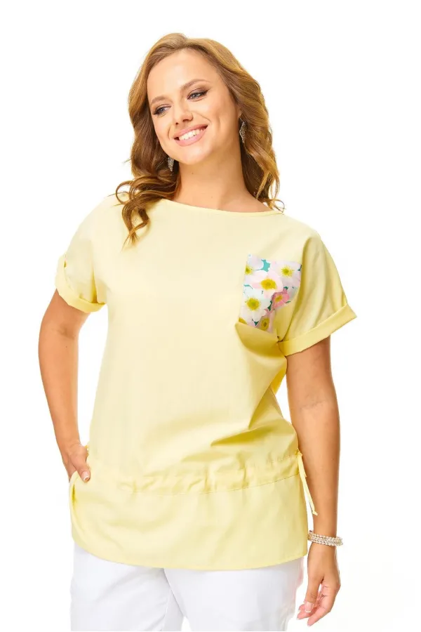 Блуза свободного силуэта. Горловина овальная, рукав цельнокроеный короткий с манжетой. Верхняя часть переда декорирована цветной термопечатью. По бокам невысокие разрезы. Ниже линии талии кулиска, шнур завязывается по бо... Читать далее...