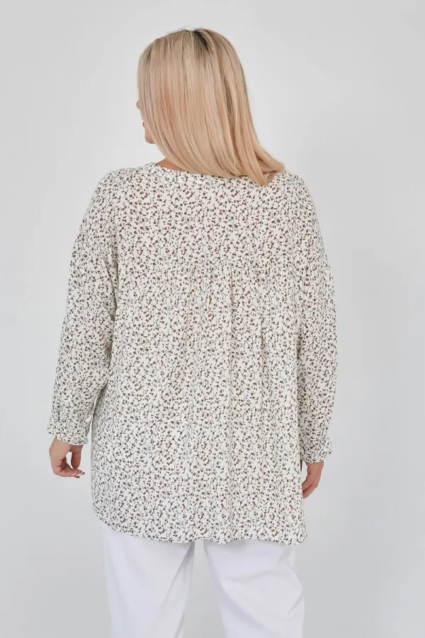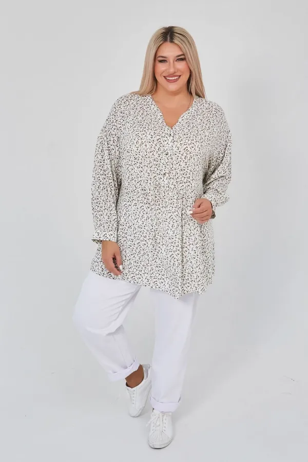Оригинальная женская туника от бренда Luxury plus. Модель свободного силуэта, выполнена из вискозного полотна в мелкий принт. Прилегание по переду за счёт вертикальных рельефов. Центр переда с горизонтальным подрезом. V – образная горловина оформлена планкой - поло с застёжкой на петли и пуговицы. Нижняя часть переда дополнена мелкой сборкой. Спинка также имеет горизонтальную кокетку и мелкую сборку в нижней части. Длинный рукав, на приспущенной пройме, по низу оформлен складками и манжетой с застёжкой на петлю и пуговицу. Комфорт и стиль в одной модели.