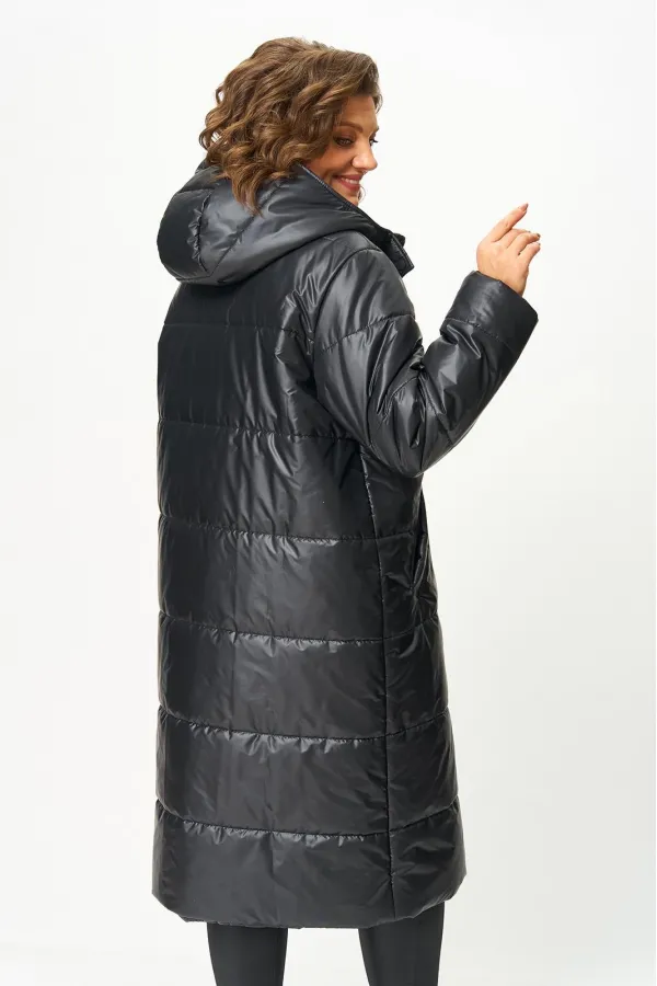 Полочка с центральной застежкой на молнию и притачной планкой с застежкой на кнопки. На полочке выполнены карманы с листочкой. Спинка цельная . Пальто с капюшоном. Рукав одношовный, втачной, по низу рукава, с внутренней стороны настрочена резинка. Пальто на подкладке.