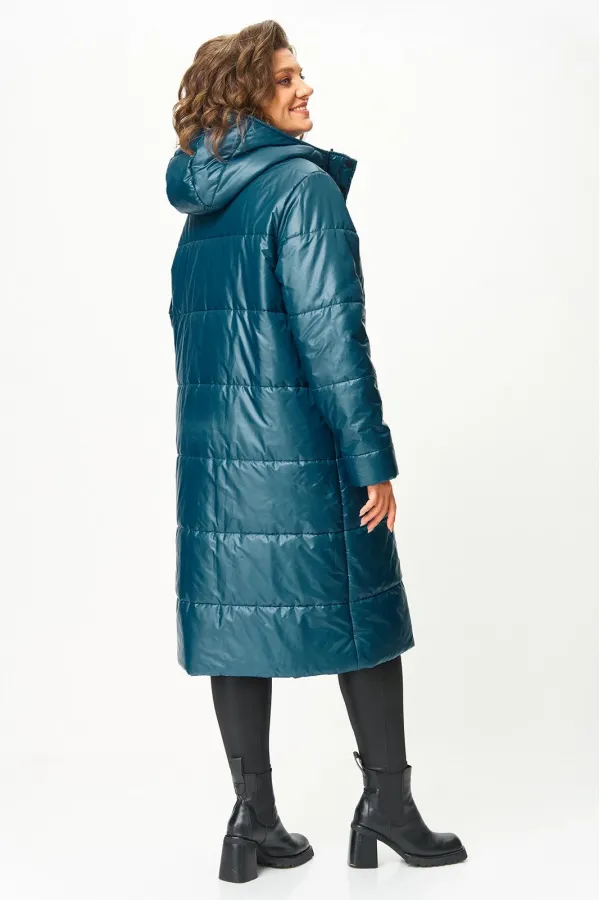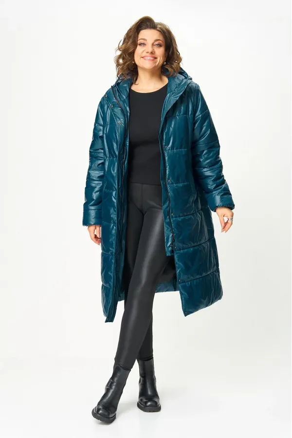 Полочка с центральной застежкой на молнию и притачной планкой с застежкой на кнопки. На полочке выполнены карманы с листочкой. Спинка цельная . Пальто с капюшоном. Рукав одношовный, втачной, по низу рукава, с внутренней стороны настрочена резинка. Пальто на подкладке.